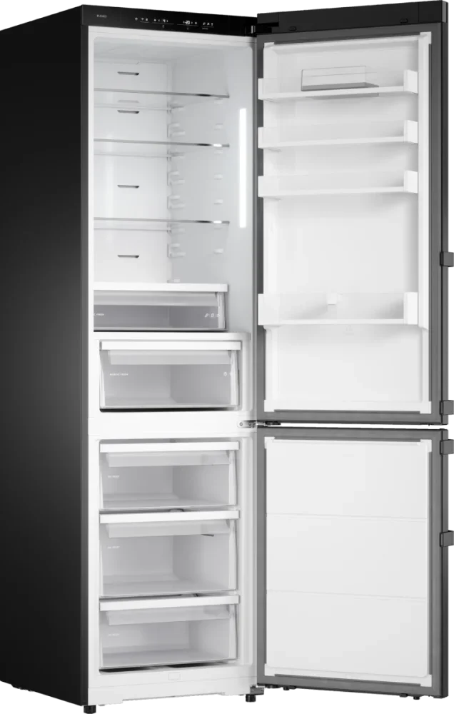 Холодильник ASKO RFC226RNB B1 — стильное и продуманное устройство серии Series 2 в цвете черная сталь, созданное для тех, кто ценит утонченность и функциональность в одном корпусе. Отдельностоящий прибор высотой 203 см, шириной 59 см и глубиной 65 см (габариты 203×59×65 см, упаковка 210×66×79 см) сочетает в себе холодильную и морозильную секции: 2 камеры с расположением низкотемпературного отсека снизу обеспечивают общую вместимость 442 л и полезный объем 388 л, при этом холодильный отсек имеет общий объем 295 л (полезный 267 л), а морозильный — 147 л (полезный 121 л). Внутренняя организация продумана до мелочей: в холодильной части три прочные стеклянные полки, четыре полки в дверце, лоток для яиц и зона свежести Nordic Fresh с двумя контейнерами для длительного хранения продуктов; морозилка оснащена тремя выдвижными ящиками, лотком для льда и функциями суперзамораживания и No Frost, что исключает образование инея и снижает необходимость ручной разморозки. Управление реализовано электронно при помощи сенсорных кнопок и LED-дисплея, предусмотрено регулирование температуры, индикация открытой двери звуковая, а при повышении внутренней температуры срабатывает световой и звуковой сигнал; также доступно приложение ConnectLife для дистанционного контроля и дополнительные режимы — Шаббат, Вечеринка и Режим очистки, плюс адаптивный температурный контроль и контроль уровня влажности для оптимального микроклимата. Технические характеристики отвечают современным требованиям: инверторный компрессор на одном блоке с экологичным хладагентом R600A гарантирует тихую работу на уровне 34 дБ, энергоэффективность класса A++ при годовом расходе 197 кВт·ч и возможность автономного сохранения холода до 13 часов; производительность замораживания достигает 13 кг/сутки. Дополнительные удобства включают возможность перевешивания дверей (упор справа по умолчанию), регулируемые ножки, ручку с гравировкой бренда и комплектную полку для бутылок на телескопических направляющих для легкого доступа. Внешний минималистичный дизайн в сочетании с антибактериальным покрытием внутри обеспечивает не только презентабельный вид, но и гигиеничность хранения, а циркуляционная система охлаждения равномерно распределяет холод по трём температурным зонам, улучшая сохранность еды и напитков; длина шнура 3 м, напряжение питания 220-240 В и частота 50-60 Гц делают установку гибкой в домашних условиях. Этот аппарат — продуманное решение для большой семьи или тех, кто любит запасаться продуктами заранее: вместительность, интеллектуальные режимы и надежные технические решения гарантируют комфорт в эксплуатации и долгий срок службы.