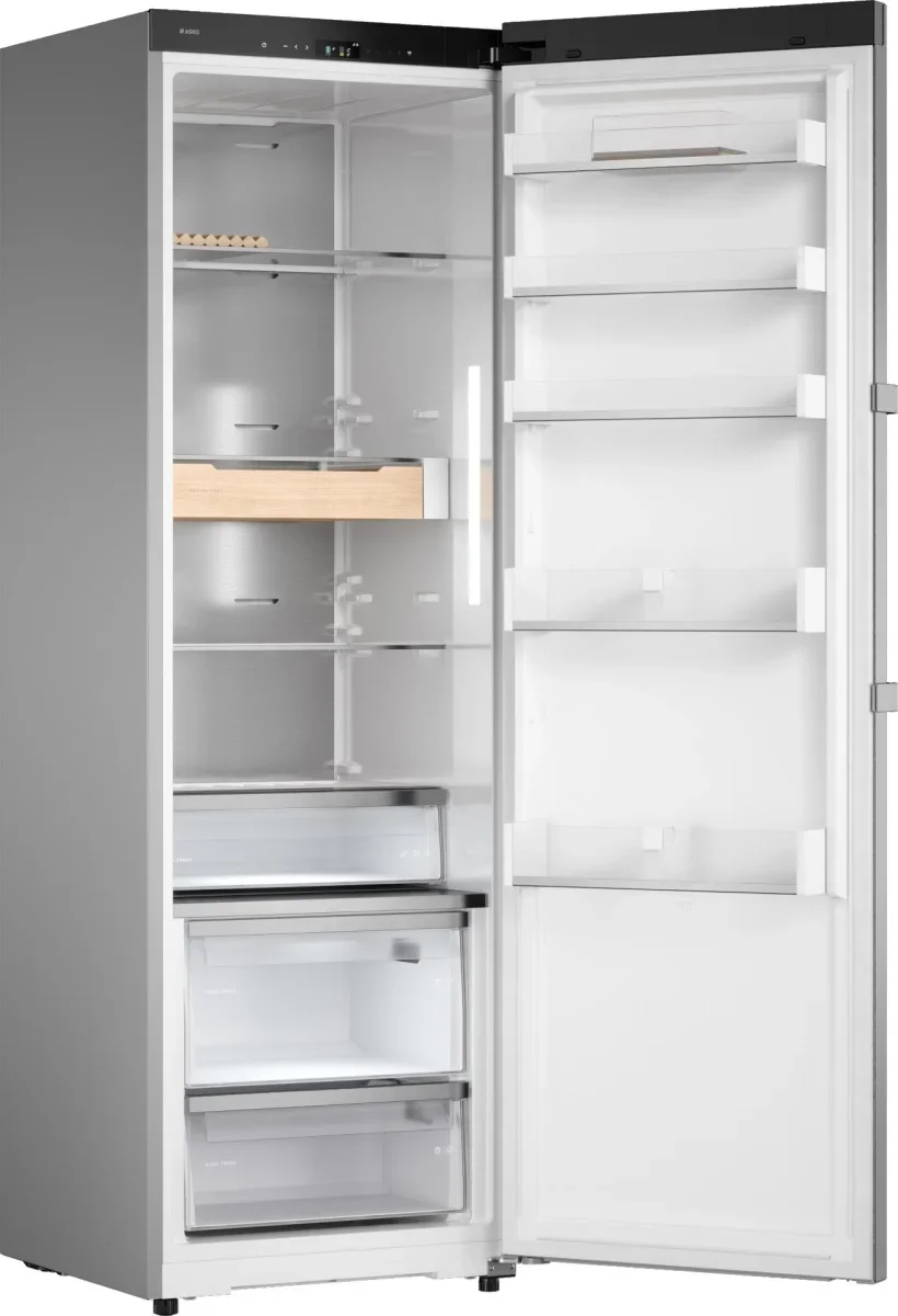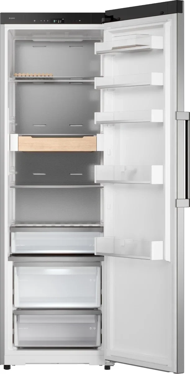 Холодильник ASKO RFR586KNCS1 — это свободно стоящий прибор высотой 185 см и компактной фронтальной базой 59×59 см, выполненный в благородном оттенке нержавеющей стали, который легко впишется в современную кухонную обстановку. Его лаконичный корпус серии 5 сочетает премиальные материалы с практичными решениями: задняя стенка из нержавеющей стали AISI 304 обеспечивает долговечность, а ручка с фирменной гравировкой и деревянные аксессуары из ясеня с масляной пропиткой добавляют тактильного и визуального уюта. Интерьер одной камеры рассчитан на общий объём 396 л и полезный объём 365 л, предлагая продуманную хранительскую организацию: пять прочных стеклянных полок, пять держателей на дверце, отдельная полка для бутылок, подставка для яиц и зона свежести DuraFresh™ с двумя контейнерами и собственной светодиодной подсветкой позволят сохранить продукты в оптимальном состоянии. Электронная система управления с сенсорными кнопками и цветным TFT-дисплеем делает настройку интуитивной: регулировка температуры, функция суперохлаждения и адаптивный контроль создают стабильный микроклимат в двух температурных зонах, а режимы Партия, Ночной режим, Шаббат и режим очистки добавляют удобства при разных сценариях использования. Прибор оснащён одним инверторным компрессором и циркуляционной системой охлаждения на экологичном хладагенте R600A, что обеспечивает тихую работу на уровне 34 дБ при высокой энергоэффективности класса A++ и годовом расходе 141 кВт·ч; длина сетевого шнура 3 м, напряжение 220-240 В, частота 50-60 Гц, максимальная потребляемая мощность при подключении 215 Вт. Для комфортного монтажа предусмотрена возможность перевешивания дверцы, регулируемые ножки, установка в стандартную нишу KitchenFit и опция Side-by-Side, а упаковочные габариты 192×66×73 см и масса нетто 69,5 кг облегчают доставку. Внутреннее LED-освещение, вентиляция и звуковой индикатор открытой двери помогают контролировать содержимое, а телескопические направляющие и комплектная полка для бутылок повышают удобство эксплуатации. Этот холодильник сочетает функциональность и стиль: продуманная эргономика, премиальные отделочные решения и расширенные режимы работы делают его привлекательным предложением для тех, кто ценит аккуратное хранение, энергоэффективность и современные цифровые опции управления через приложение ConnectLife с тактильной обратной связью, позволяя получить уверенную настройку и мониторинг в любое время. В результате вы получаете надёжное и тихое решение для хранения продуктов с высоким уровнем контроля влажности и свежести, адаптированное к повседневным потребностям и требовательной эстетике кухни, где каждый элемент — от материалов до интерфейса — продуман для долговременного использования.