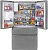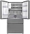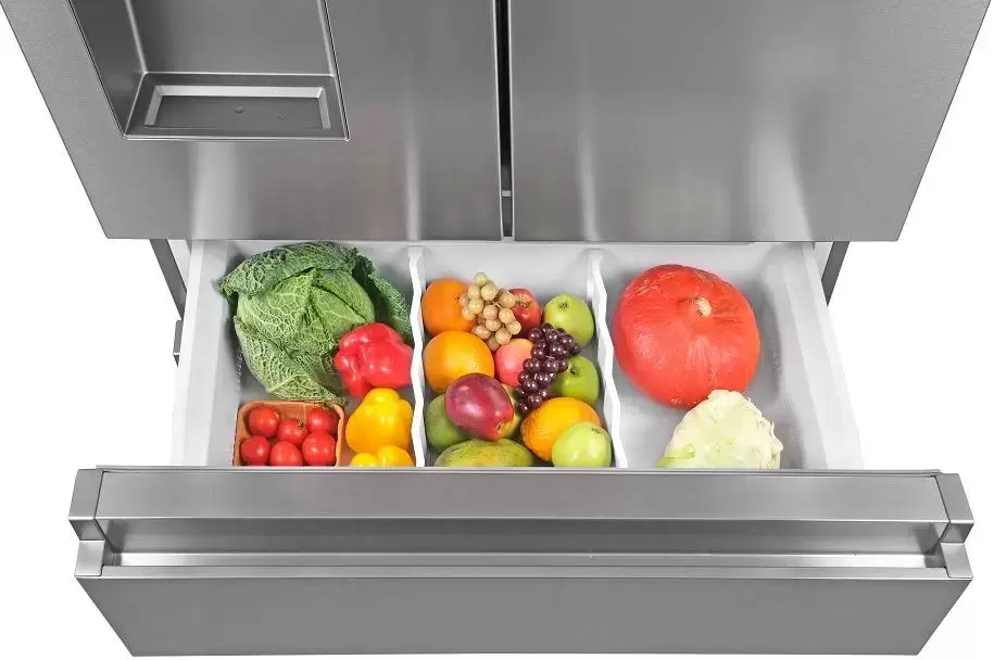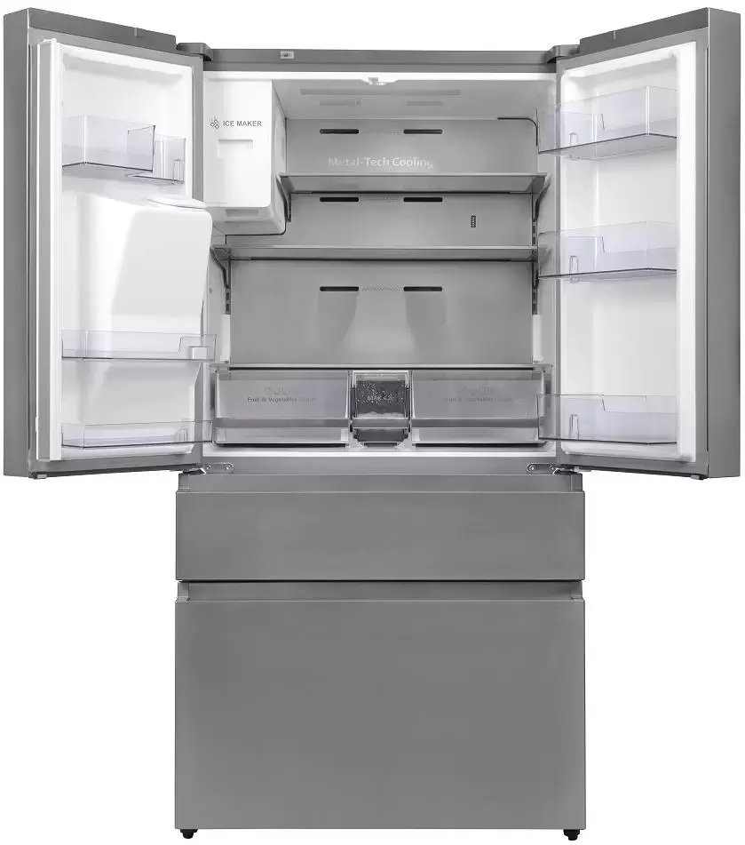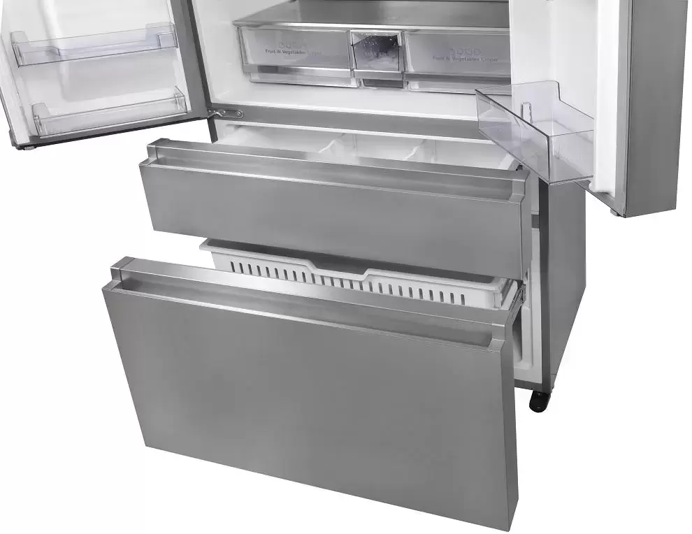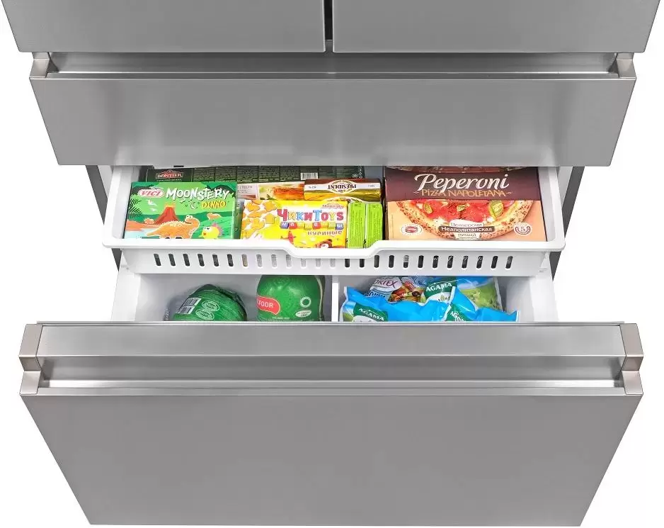 Модель имеет конфигурацию French-Door: он оборудован двумя верхними дверцами для доступа к холодильной камере и выдвижным ящиком в морозилке. Такая конструкция удобна и позволяет удерживать холод внутри камеры при открытии одного из отделений.