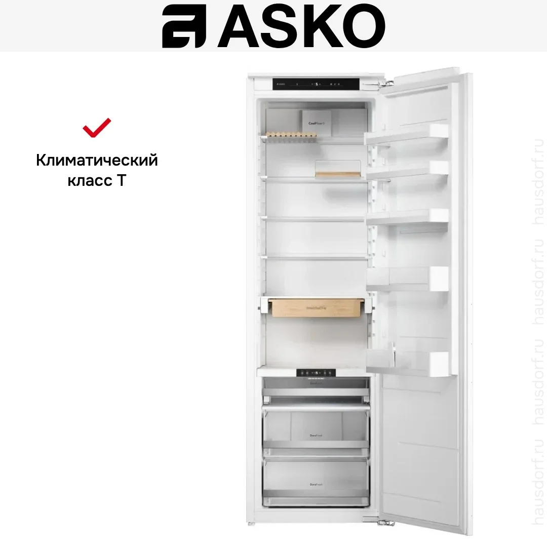 Asko R31842I — встраиваемый холодильник объемом 300 л. Имеет 5 стеклянных полок и 5 переставных на двери, оснащен зоной свежести DuraFresh™ с независимым температурным режимом. LED освещение позволяет легко ориентироваться внутри прибора. Управляется с помощью электронной панели.