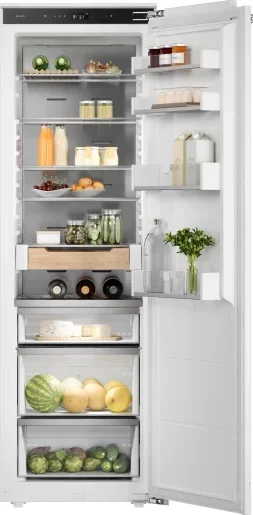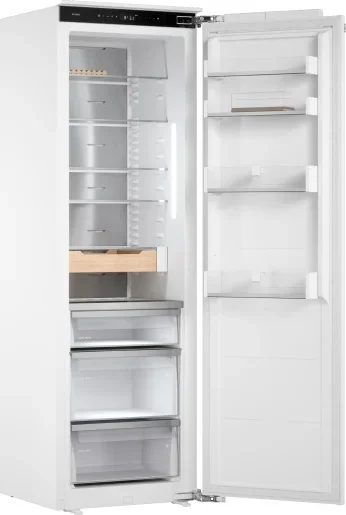 Встраиваемый холодильник ASKO RBR576DNC1 создан для тех, кто ценит аккуратность интерьерного решения и безупречную заботу о продуктах: корпус рассчитан на монтаж в нишу 177.5-178 × 56-57 × 56 см, а сам прибор занимает 177.2 × 55.7 × 54.5 см, благодаря чему легко интегрируется под фасад выбранной кухни. Модель без морозильной секции объединяет вместительность общего объёма 312 л с полезным холодным пространством 245 л, что позволяет упорядочить хранение для семьи и поддерживать отдельные температурные зоны — всего их две, включая выделенную зону свежести DuraFresh™ с тремя контейнерами и собственной светодиодной подсветкой для продуктов, требующих особого микроклимата. Внутреннее наполнение организовано четырьмя полками из прочного стекла и четырьмя держателями на дверце, есть подставка для яиц и полка для бутылок в комплекте, а телескопические направляющие обеспечивают плавное извлечение ящиков. Управление реализовано по современной схеме: электронная панель с сенсорными кнопками и TFT-дисплеем обеспечивает точную регулировку температуры, поддерживает подключение к приложению ConnectLife и сопровождается тактильной обратной связью для удобства настроек. Среди режимов — суперохлаждение для быстрого понижения температуры, адаптивный температурный контроль, контроль уровня влажности, режимы «Шаббат», «Вечеринка», «Ночной режим» и специальный цикл очистки, что делает эксплуатацию гибкой и экономичной. Технологическая основа включает инверторный компрессор с одним агрегатом и хладагентом R600A, циркуляционную систему холода и коррозионно‑стойкую заднюю стенку из нержавеющей стали AISI 304, способствующую равномерному распределению воздушных потоков и стабильной работе при широком климатическом диапазоне SN‑N‑ST‑T. Яркое и экономичное светодиодное освещение обеспечивает хорошую видимость всех уровней, а тихая работа — всего 32 дБ — не нарушит спокойствия в кухонном пространстве. Энергетическая эффективность соответствует классу A++, годовой расход составляет 125 кВт·ч, при электрических характеристиках 220-240 В и 50-60 Гц; мощность подключения 215 Вт, предохранитель 1,2 А, длина сетевого шнура 3 м. Внешняя эстетика выдержана в линейке Series 5: прибор поставляется под навес вашего фасада, дополнен деревянными аксессуарами из ясеня с масляной пропиткой и ручкой с гравировкой бренда, что придаёт мебели благородный акцент. Практичность поддержки монтажа выражена в возможности перевешивания дверцы и жёстком креплении по системе door on door для аккуратного сопряжения с фасадом; предупреждение о незакрытой двери реализовано звуковым сигналом. Для тех, кто ищет встроенное решение с продуманной организацией внутреннего пространства, интеллектуальными режимами и премиальными материалами отделки, этот холодильный агрегат станет надёжным союзником в повседневной заботе о качестве продуктов.