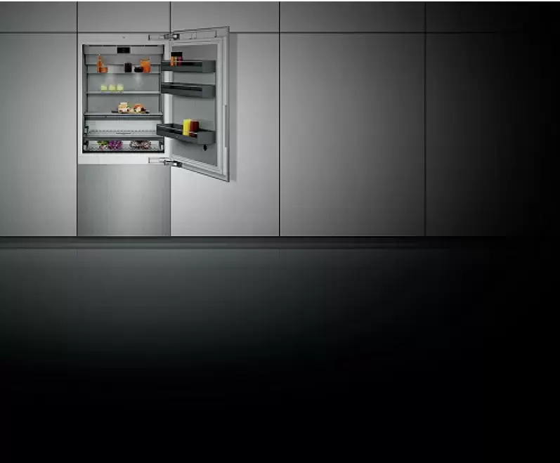 Встраиваемый холодильник Gaggenau RB 492-304 — двухкамерный агрегат с большой зоной свежести и морозильным отсеком в виде ящика снизу, выпущенный в 2025 году. Он соответствует климатическому классу SN-ST и предназначен для работы при наружной температуре от +10 до +38 градусов. Габариты модели Гаггенау (высота — 213 см, ширина — 91 см, глубина — 63 см) соответствуют стандартам: она встраивается в обычный мебельный гарнитур или нишу. Объем холодильной камеры составляет 347 л, морозильника — 140, нулевой зоны — 34. Корпус и внутренняя отделка выполнены из нержавеющей стали, на дверь жестко крепится декоративная панель в соответствии со стилем мебели, обеспечивающая дополнительную теплоизоляцию. Прочная конструкция не ограничивает угол открытия.