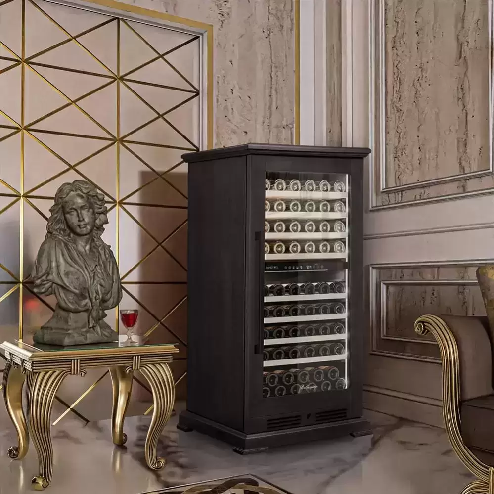 Внутренняя компоновка рассчитана на 99 бутылок объёмом 0,75 л и общий объём 265 литров. Девять выкатных полок из массива бука аккуратно фиксируют бутылки, уменьшают риск контактного повреждения пробок и упрощают доступ к коллекции. Для нестандартных бутылок предусмотрена отдельная полка, а панорамное и демонстрационное освещение с тремя цветами — белым, синим и янтарным — выгодно подчёркивает этикетки и создаёт выставочный эффект.