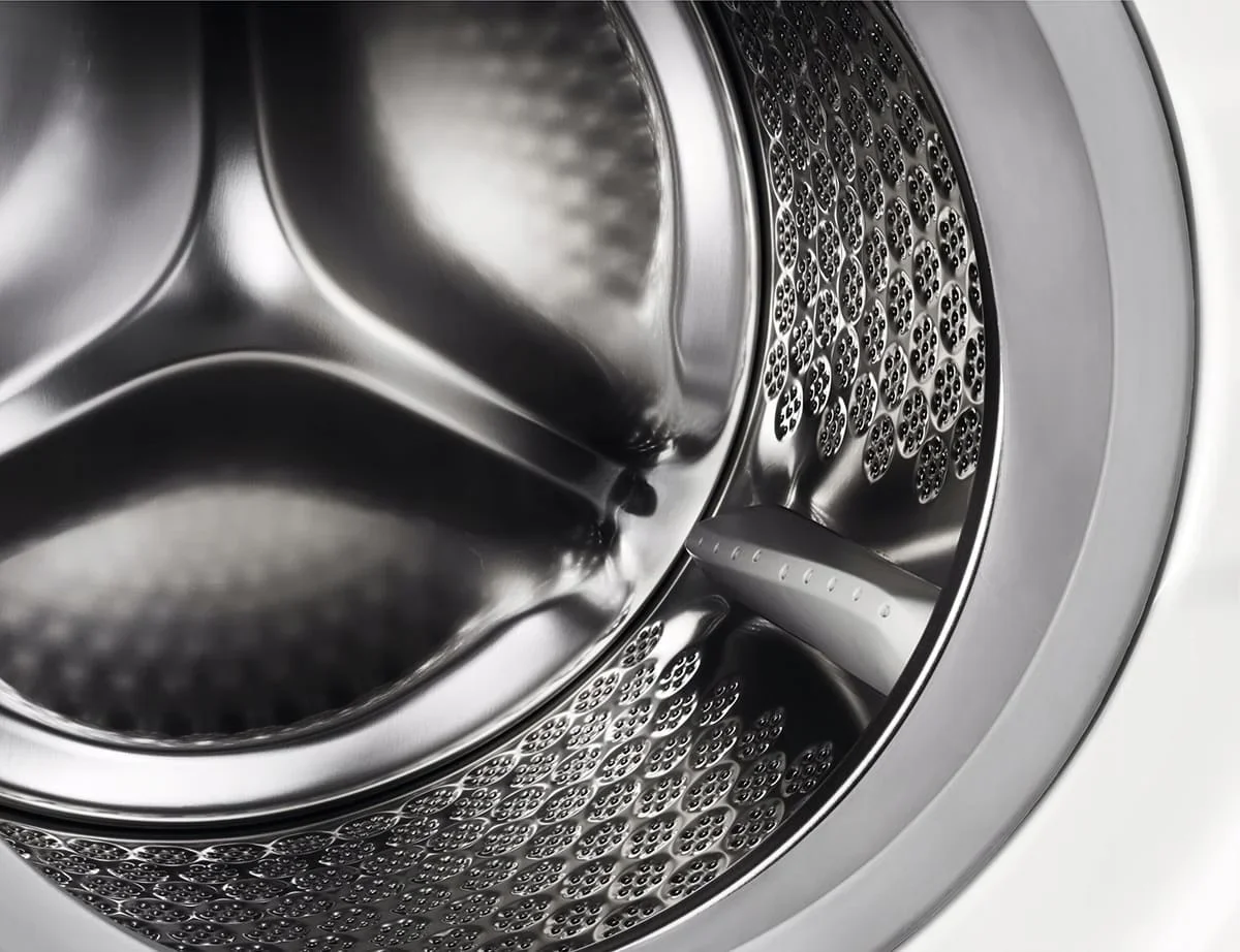 Встраиваемая стиральная машина Electrolux EWN7F447WIP — стильное решение для аккуратной интеграции в кухонный или нишевой гарнитур: чистые белые панели и люк одинакового оттенка обеспечивают единый визуальный ряд с фасадами, а продуманная глубина и размеры для встраивания 82×60×56 см позволяют скрыть прибор за дверцей, не жертвуя вместительностью. Корпус компактный (81.9×59.6×55.3 см), но барабан из нержавеющей стали на 52 л вмещает до 7 кг белья и гарантирует долговечность. Интерфейс сочетает поворотный программатор и сенсорные кнопки, LED-дисплей отображает ход цикла, температуру, скорость отжима и оставшееся время, а инверторный мотор обеспечивает тихую работу и устойчивый ресурс.