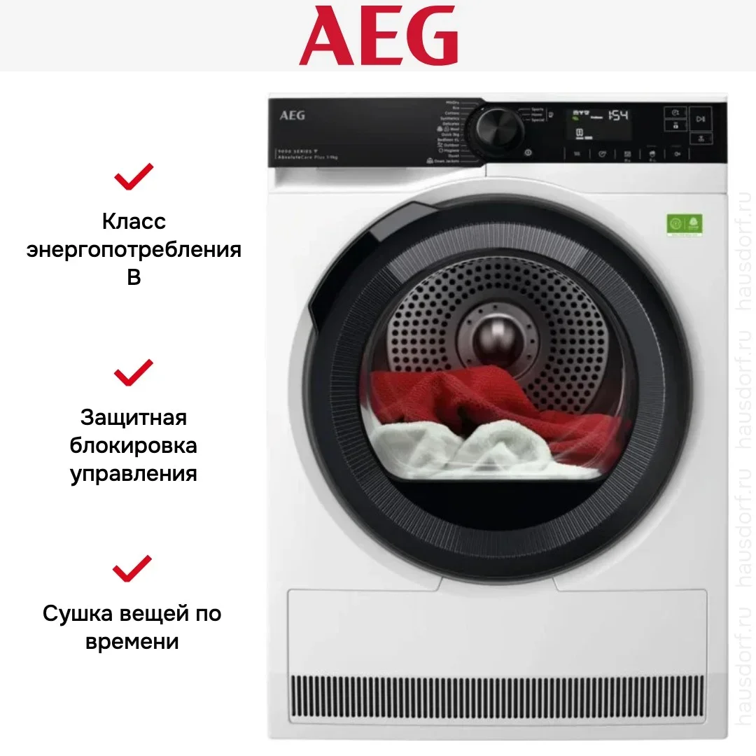 Сушильная машина AEG предназначена для домашнего использования, поэтому имеет стандартные габариты и большое разнообразие программ. Так как она устанавливается отдельно, нужно заранее найти достаточно места в помещении.