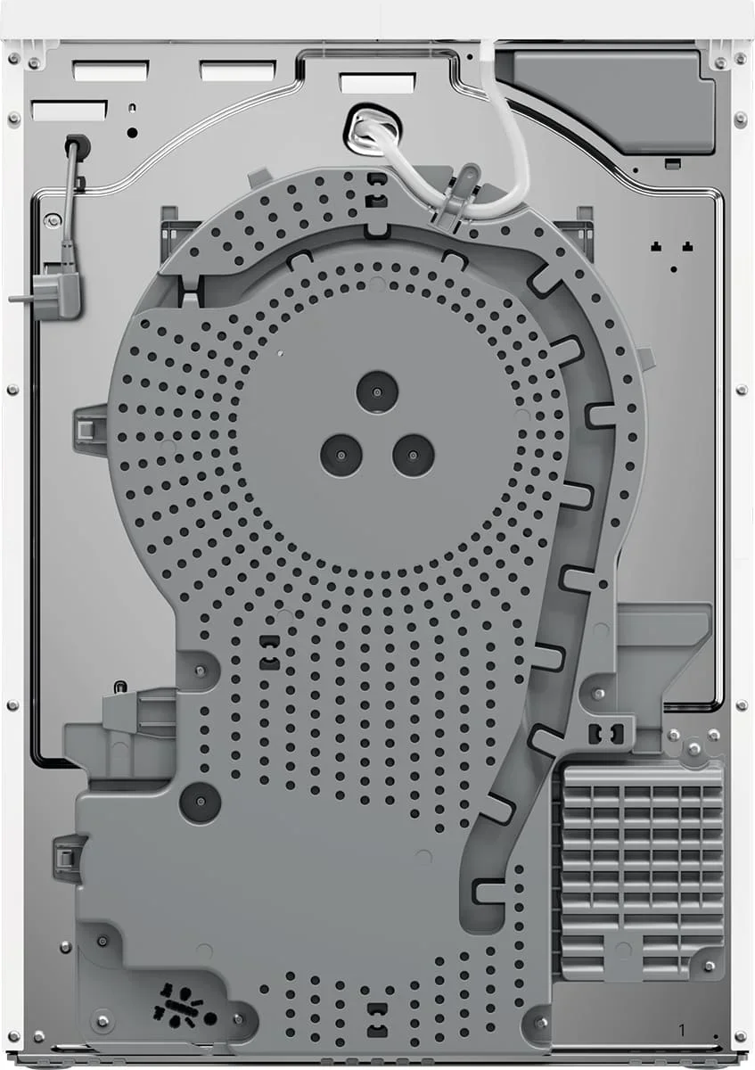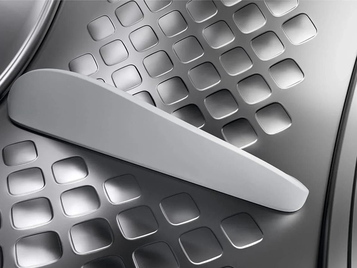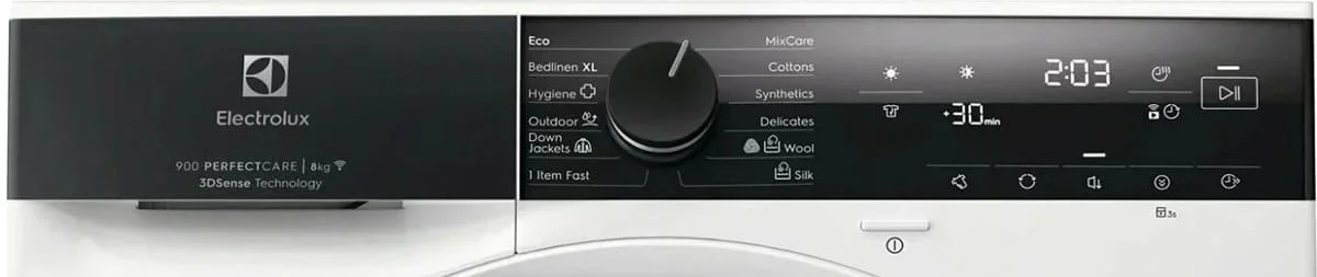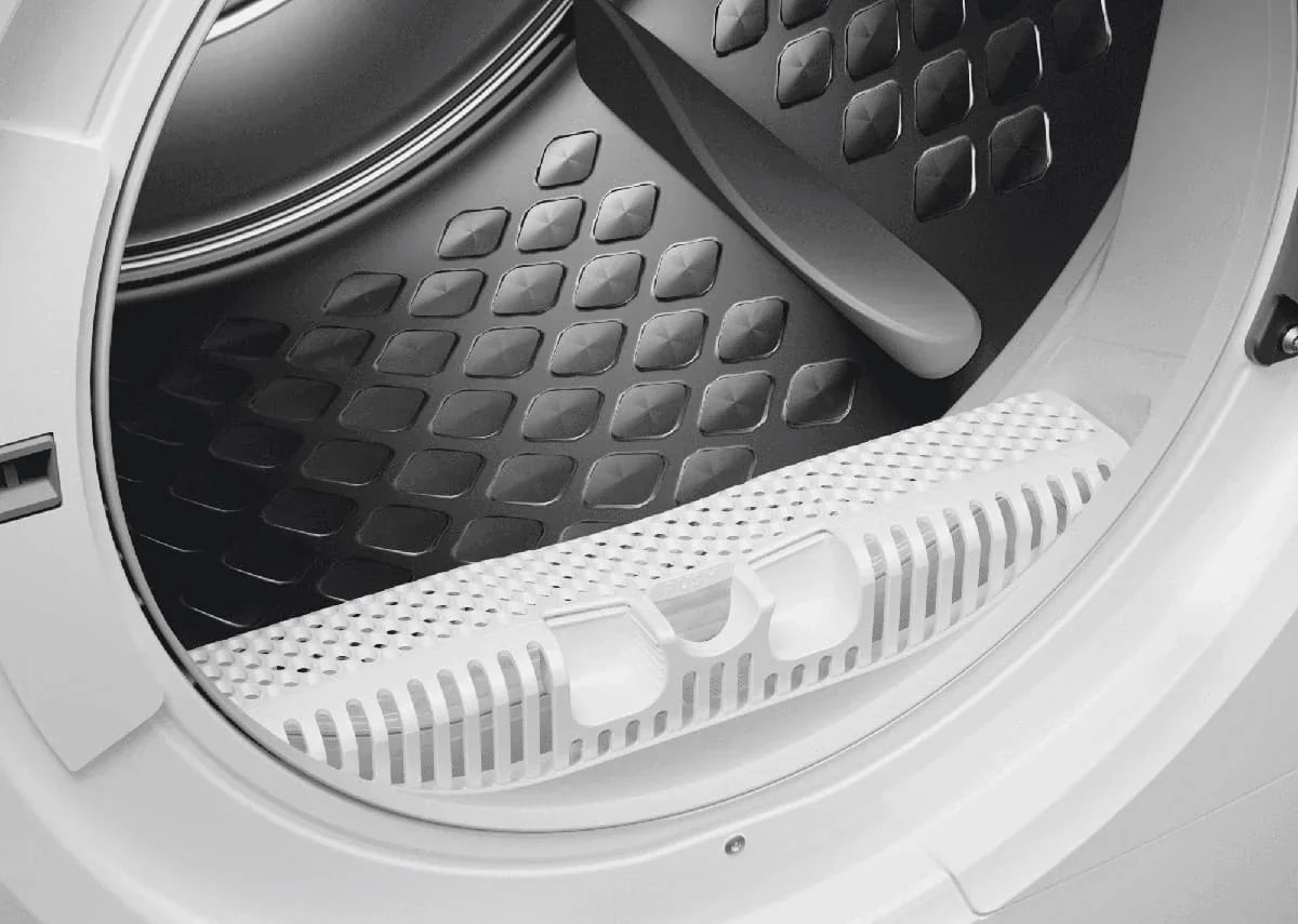 Сушильная машина Electrolux EW7D495UE — стильный бытовой аппарат в белом корпусе с чёрной горизонтальной панелью и круглой стеклянной дверцей. Размеры 85×59.6×63.6 см подходят для отдельностоящей установки, а навес справа упрощает размещение. Тепловой насос обеспечивает экономичную и бережную обработку тканей, класс энергопотребления C при подключении 550 Вт и потребляемой мощности 0.55 кВт. Объём барабана 118 л позволяет загружать до 9 кг белья; подсветка внутри помогает при укладке. Инверторный двигатель снижает уровень шума до 63 дБ и повышает надёжность. LED‑дисплей показывает время до завершения, заполнение ёмкости для конденсата и длительность фазы «антисминание». Горизонтальная панель с сенсорными клавишами даёт доступ к выбору степени и времени сушки, отсрочке старта, лёгкому глажению, сигналу окончания и функции «Освежить». Встроены 12 программ: хлопок, лён, синтетика, шёлк, шерсть, деликатные вещи, спортивное бельё, верхняя одежда, вещи с пуховым наполнителем и постельное белья; есть реж
