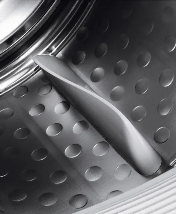 В барабан единовременно можно загрузить 8 кг. Его реверсивное вращение предотвращает сбивание вещей в ком и образование дисбаланса. Подсветка — не только красивая, но и функциональная деталь, так как дает хороший обзор, как проходит сушка. Цвет корпуса — белый.