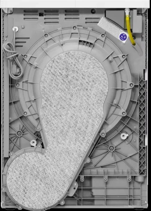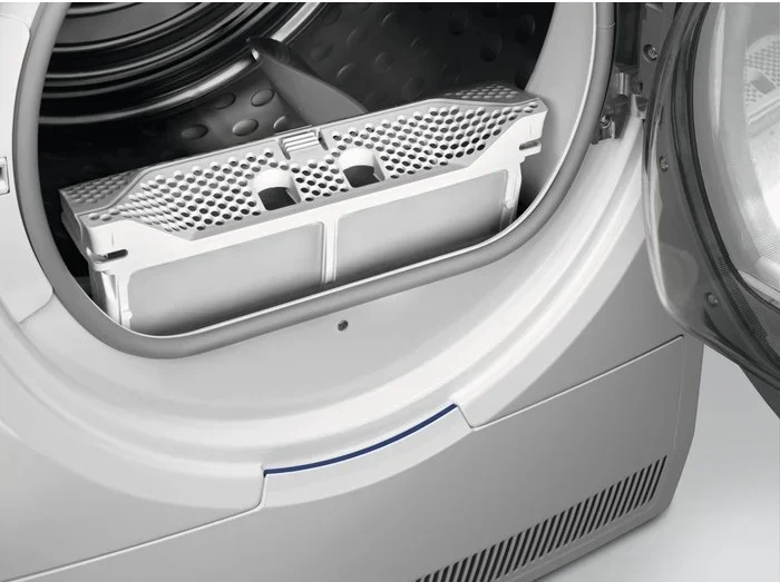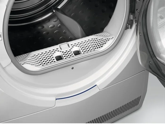 Тип сушки белья в данной модели — конденсационная с тепловым насосом. Это самый распространенный вариант, так как его просто реализовать и в работе он надежен, безопасен и удобен.