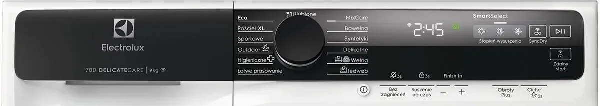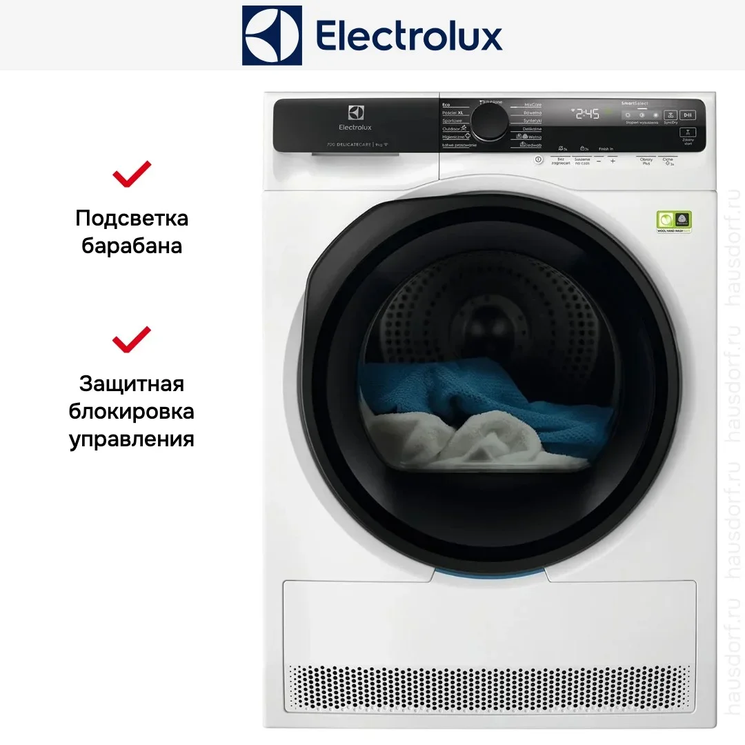 Сушильная машина Electrolux EW9D587KCE — современное решение для дома, созданное с упором на элегантность и практичность: лаконичный белый корпус в сочетании с чёрной панелью управления и стеклянной круглой дверцей выглядит стильно и аккуратно, а компактные габариты 85×59.6×63.6 см позволяют разместить изделие в квартире, где важна экономия пространства. Горизонтальная сенсорная панель с LED-дисплеем подчёркивает премиальность внешнего вида и удобство эксплуатации; управление интуитивно понятно, доступна визуальная индикация этапа цикла, оставшегося времени и состояния конденсата. Подсветка внутри барабана облегчает загрузку и выгрузку, а навес дверцы справа обеспечивает комфорт при монтаже в нише или отдельно стоящее положение.