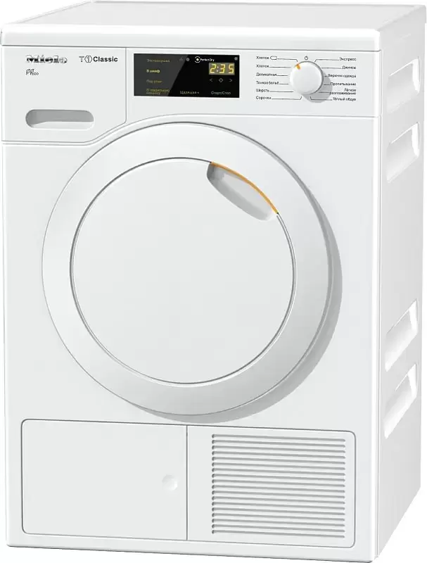 Сушильная машина Miele с электронным управлением и опцией FragranceDos. 7-сегментный дисплей отображает всю необходимую информацию и выставленные настройки. В модели предусмотрено освещение барабана, что значительно повышает комфорт использования прибора.