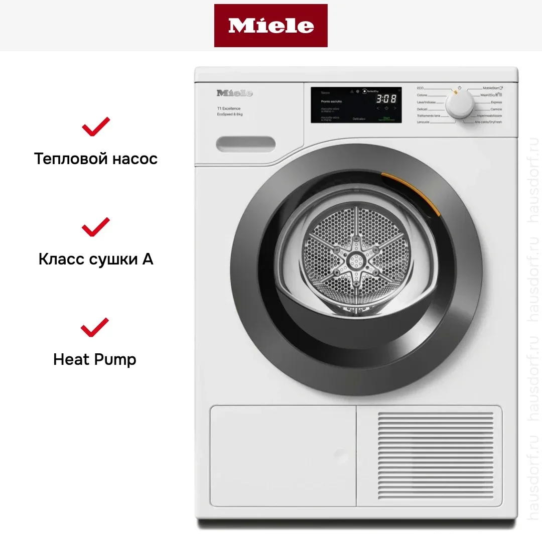 Сушильная машина Miele TEC645WP Chrome Edition — это продуманное решение для дома, где важны экономия, деликатность обращения с тканями и современный внешний вид. Корпус выполнен в стиле Chrome Edition с панели цвета «белый лотос» и графитовой дверцей, что делает прибор аккуратным и универсальным для любой кухни или прачечной. Компактные габариты 85×59,6×63,6 см позволяют интегрировать устройство в колонну, установить под столешницу или расположить рядом со стиральной машиной, формируя единый блок.