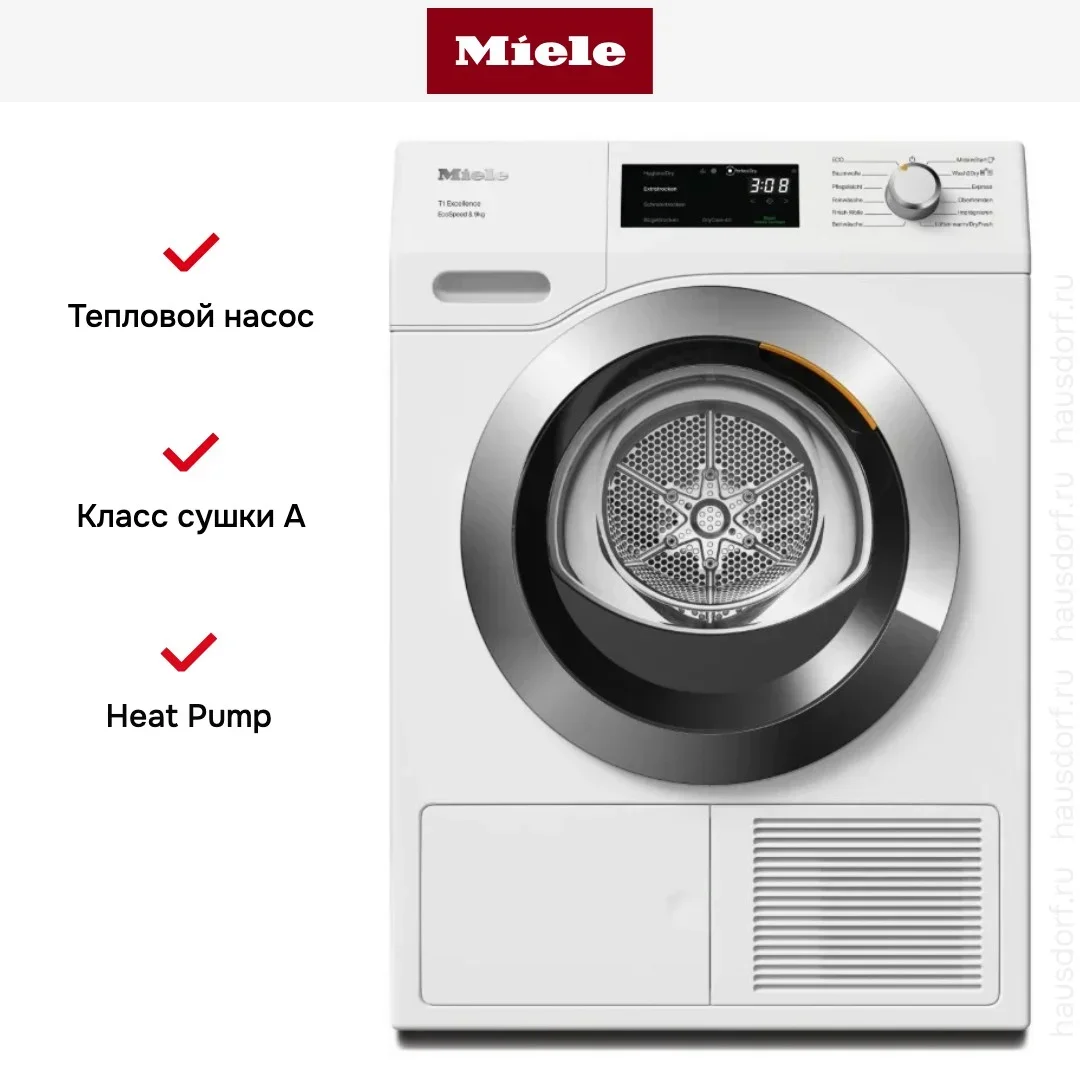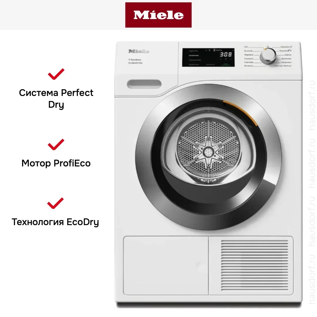 Управление сочетает поворотный программатор и сенсорные кнопки с 7‑сегментным дисплеем DirectSensor. Система PerfectDry контролирует остаточную влажность и учитывает минерализацию воды для точной сушки. Есть режимы «Под утюг», «Супер 40» и стандартные для хлопка, деликатных тканей и шерсти. Специальные опции включают гигиеническую сушку, пропитывание, тёплый и холодный обдув, антисминание и программу для мужских сорочек.