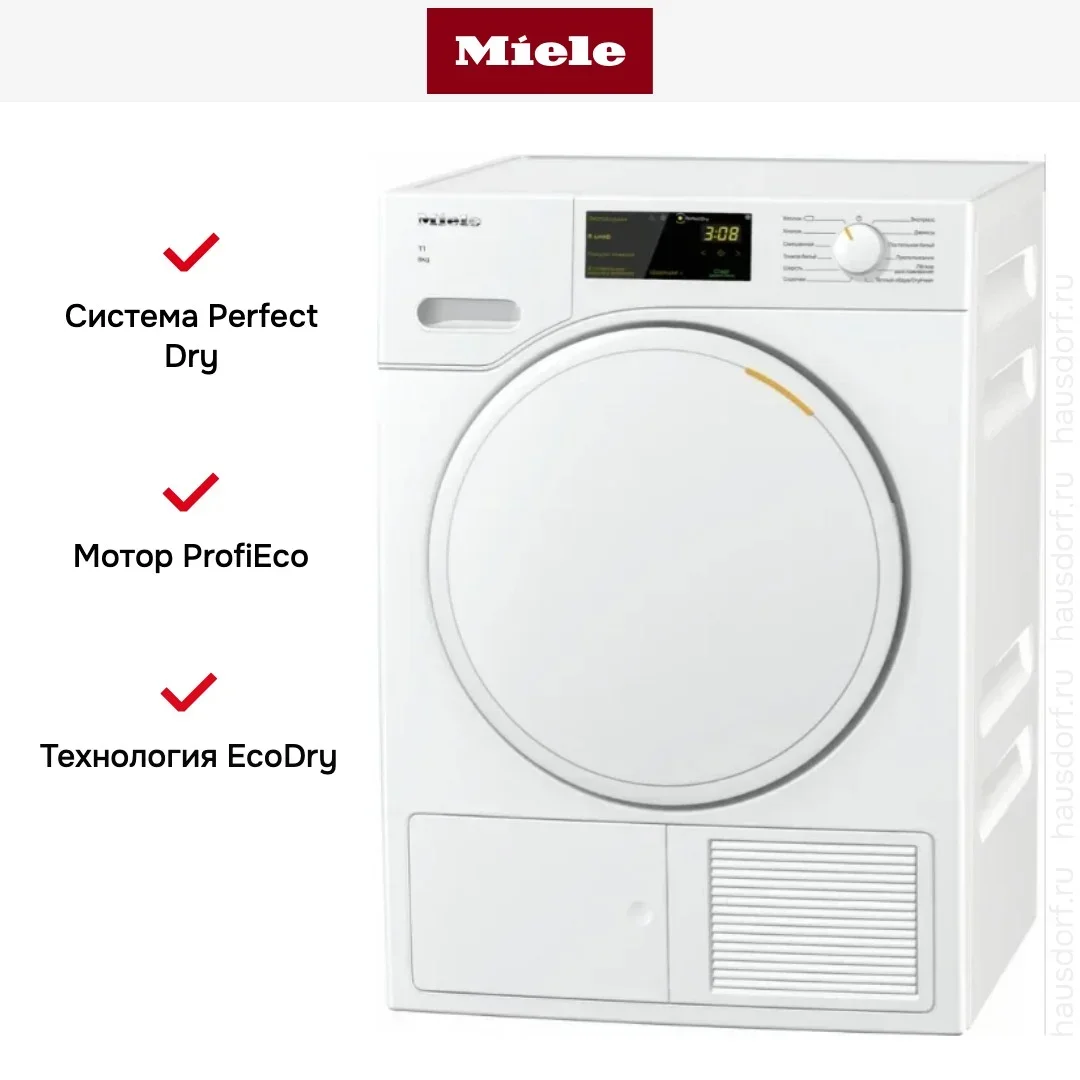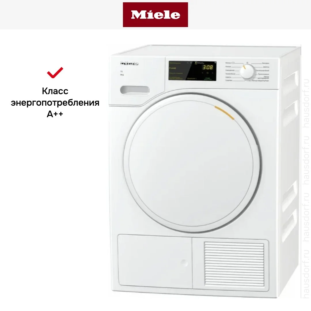 Сушильная машина Miele TWC220WP с тепловым насосом — это современное дополнение для технического оснащения дома. Модель обеспечивает эффективную сушку вещей из различных типов тканей за счет наличия разнообразных программ с индивидуальными настройками, которые бережно и деликатно относятся к разнообразной одежде. Среди них режим для мужских сорочек, джинсов или смешанного белья. Для того, чтобы минимизировать заломы предусмотрена опция антисминания, после которой большинство вещей можно не гладить. Прибор представлен в классическом белом цвете, который хорошо сочетается со стиральной машиной этого же бренда, а также с различными стилевыми решениям интерьера ванной комнаты или домашней прачечной. Большой люк, а также внутренняя подсветка обеспечивают удобную загрузку и выгрузку белья, а непрозрачная дверца обеспечивает дополнительную эстетику внешнего вида. Устройство характеризуется низким потреблением электроэнергии, что делает модель экономичным вариантом.
