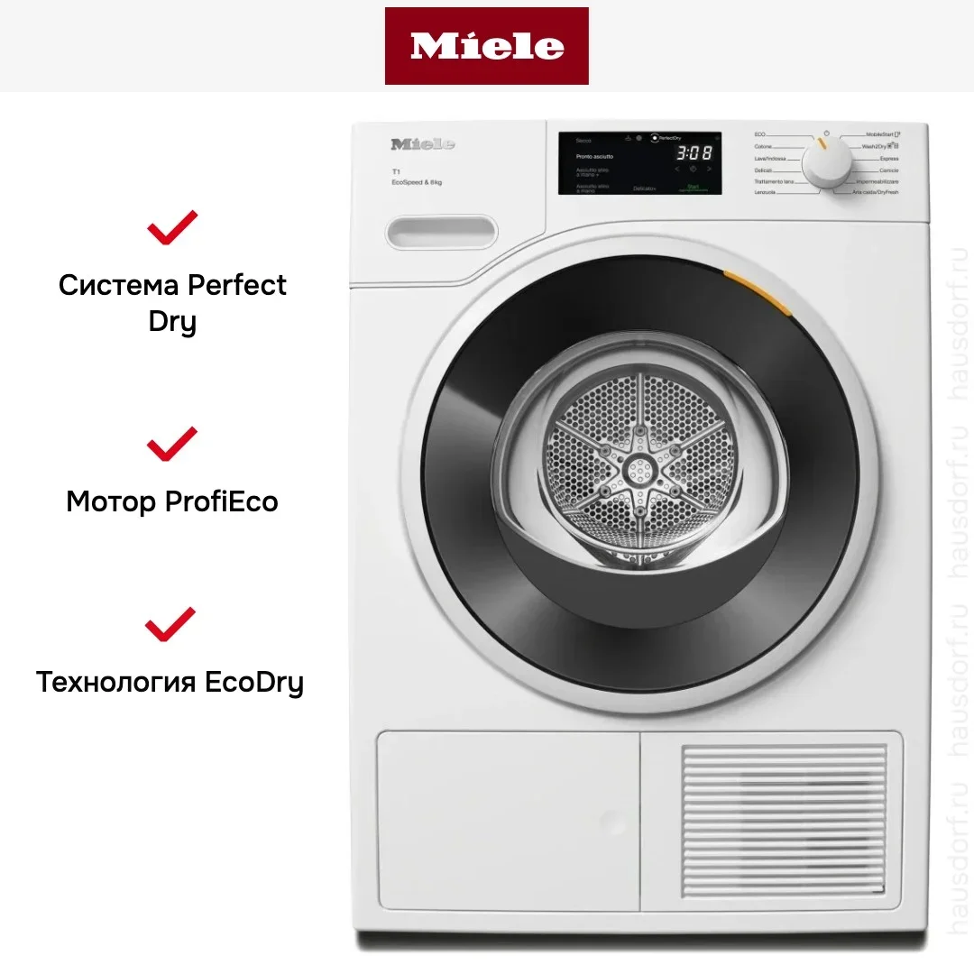 В основе работы — тепловой насос с компрессором, который обеспечивает мягкую и экономичную сушку. Класс энергопотребления A+++ и класс сушки A означают низкие счета за электричество и эффективное удаление влаги. Система PerfectDry измеряет остаточную влажность и автоматически подбирает продолжительность цикла, чтобы вещи не пересушивались. Технология EcoDry с теплоообменником без необходимости обслуживания сохраняет эффективность и надёжность работы годами.