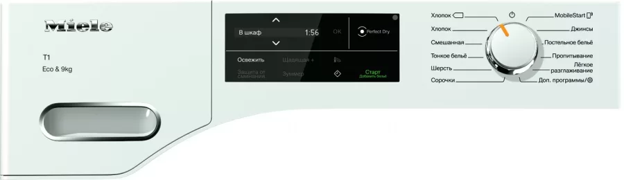 Miele TWJ660WP — сушильная машина с загрузкой 9 кг. Имеет 18 разнообразных программ сушки: хлопок, смешанное белье, пропитывание, сорочки, верхняя одежда, шерсть, шелк и другие. Легко управляется с помощь поворотного программатора, благодаря сенсорному дисплею можно следить за работой устройства и контролировать его работу.