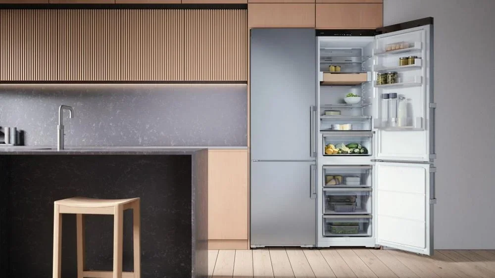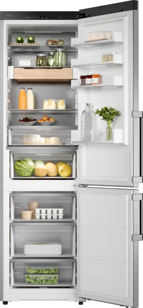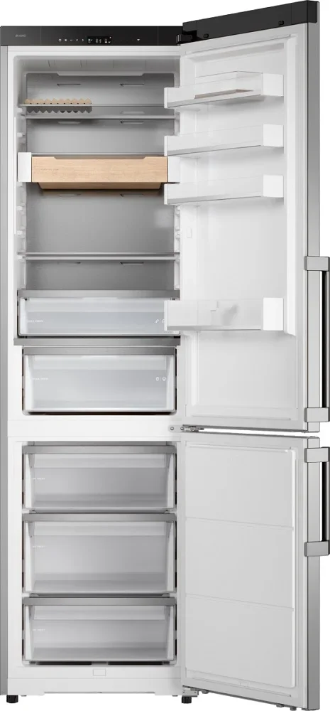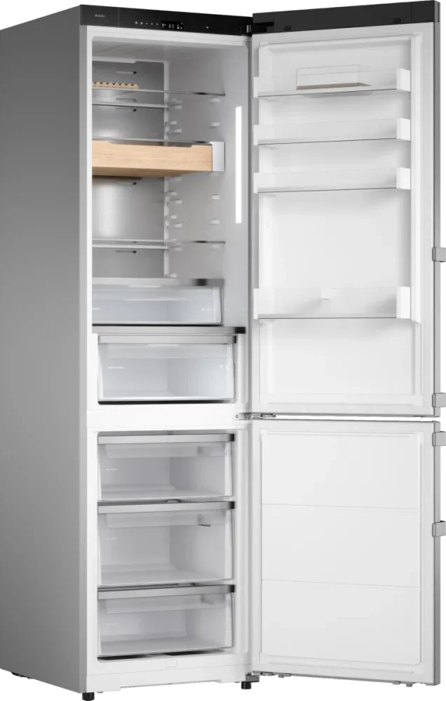 Холодильник ASKO RFC526RNBS1 — это представитель премиальной линейки, который сочетает в себе лаконичную эстетику нержавеющей стали и продуманные инженерные решения для комфортного хранения продуктов: высокий корпус 203×59×65 см обеспечивает внушительный общий объём 442 л при полезном внутреннем пространстве 388 л, где холодильная секция занимает 295 л (полезно 267 л), а морозильная — 147 л (полезно 121 л) с тремя выдвижными ящиками для удобной систематизации; морозилка расположена снизу, оснащена системой No Frost и способна замораживать до 13 кг в сутки, обеспечивая автономное сохранение холода до 13 часов. Внутренняя планировка продумана до мелочей: четыре стеклянные полки в основной камере, четыре отделения на дверце, подставка для яиц и специальный бутылочница в комплекте, две полочки в зоне свежести DuraFresh™ с отдельной светодиодной подсветкой гарантируют оптимальные условия для плодов и мяса, а телескопические направляющие упрощают доступ к продуктам; для быстрого охлаждения и заморозки предусмотрены функции суперохлаждения и суперзамораживания. Управление реализовано на современной электронной платформе с сенсорными кнопками и ясным TFT-дисплеем, есть поддержка приложения ConnectLife и тактильная обратная связь, регулировка температур активируется легко и интуитивно, предусмотрены режимы Шаббат, Вечеринка, Ночной режим и Режим очистки, также доступен адаптивный температурный контроль и контроль уровня влажности для продления свежести. Конструкция корпуса включает заднюю стенку из нержавеющей стали AISI 304, ручку с фирменной гравировкой и деревянные аксессуары из ясеня с масляной пропиткой, благодаря чему прибор гармонично впишется в современную и классическую кухню; отделение для свежих продуктов освещается светодиодами, как и морозильная камера, что создаёт равномерное комфортное освещение без бликов. Технические параметры отражают экономичность и надёжность: инверторный компрессор на один блок, хладагент R600A, циркуляционная система охлаждения, класс энергопотребления A+++ при годовом расходе 197 кВт·ч, уровень шума всего 34 дБ, мощность подключения 270 Вт, питание 220-240 В / 50-60 Гц. Практичные детали включают возможность перевешивания дверей, регулируемые ножки, длину сетевого шнура 3 м, индикацию открытой двери со звуковым сигналом и световую/звуковую тревогу при повышении температуры; упаковочные габариты 210×66×79 см, вес нетто 85 кг. Этот аппарат — отличное решение для тех, кто ценит функциональность и внимание к деталям, сочетая продвинутые режимы и долговечные материалы для ежедневного использования на высшем уровне, а также подходит тем, кто ищет сбалансированное энергопотребление и тихую работу без компромиссов с хранением.