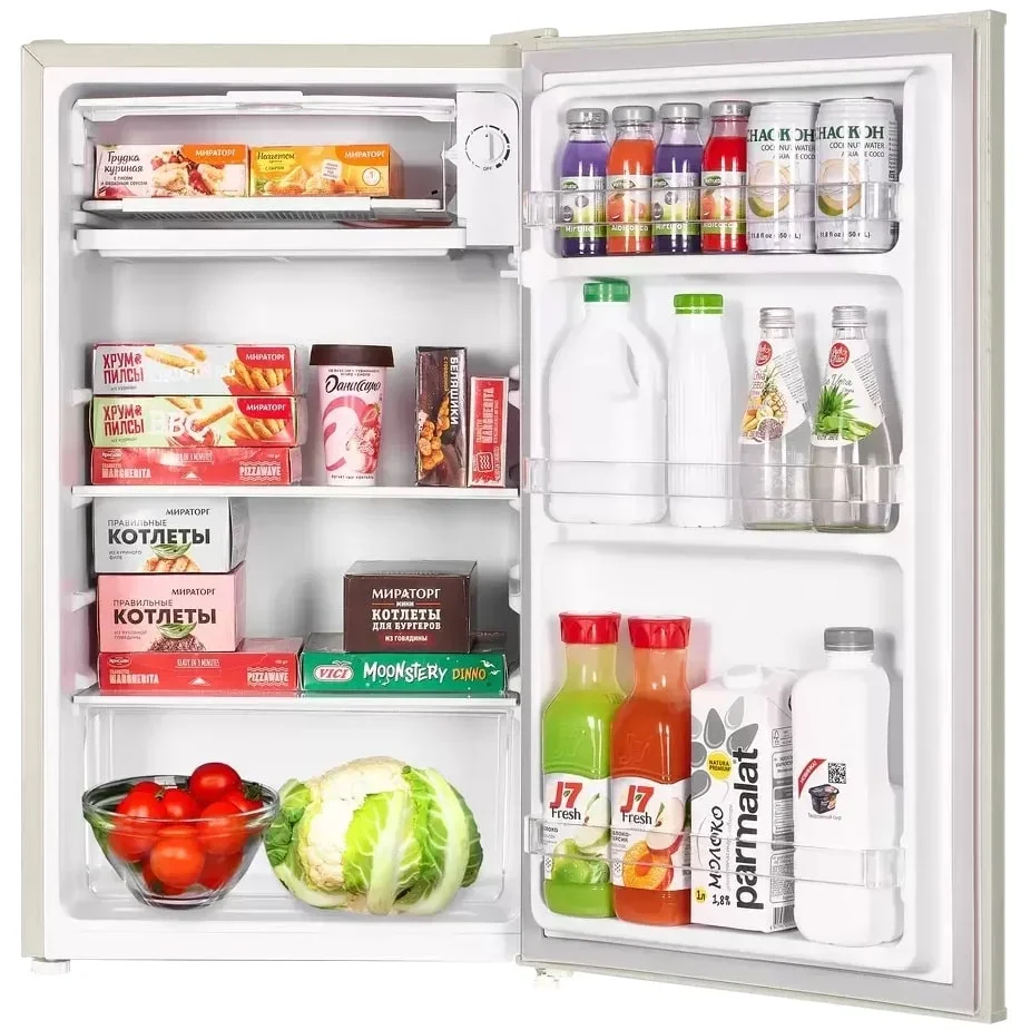 Внутреннее пространство рассчитано на общий объем 92 литра, из которых 85 литров отведено под холодильную камеру, а 7 литров — под морозильник сверху. Такая компоновка удобна для тех, кто хранит больше свежих продуктов, а морозилка нужна для заморозки готовых блюд и заготовок. Три полки в дверце и две регулируемые полки из закалённого стекла создают гибкую систему хранения; прочные стеклянные полки выдерживают вес посуды и контейнеров и легко очищаются от загрязнений.