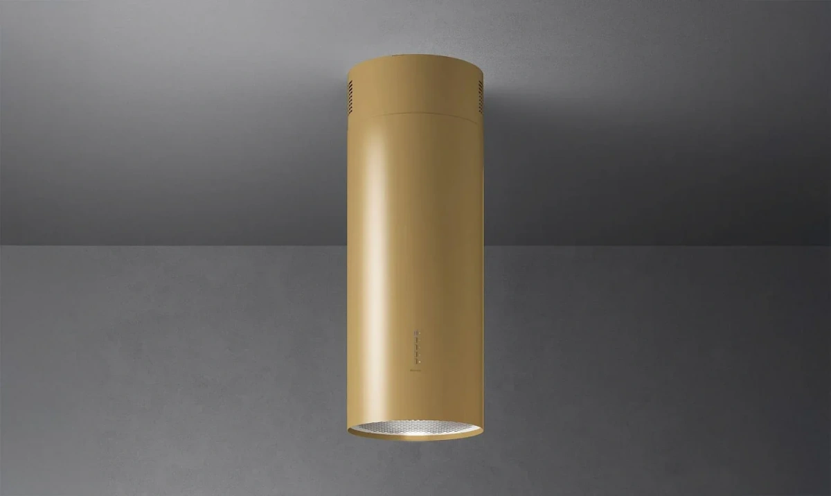 Модель выглядит как лаконичная колонна золотого цвета с четкой геометрией. Цилиндрический корпус диаметром 35 см из окрашенной стали выглядит монолитно и лаконично, без лишних деталей. Островной формат позволяет разместить вытяжку над кухонным островом — она визуально упорядочивает центр рабочей зоны и не перегружает потолочное пространство.