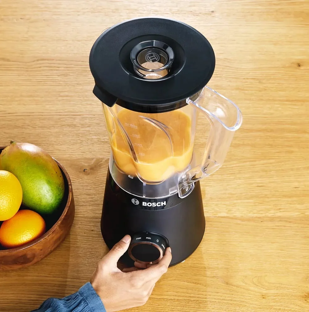 Стационарный блендер Bosch MMB6141B — стильный и мощный помощник для повседневной кулинарии, который удобно разместится на любой кухонной стойке. Его чёрный корпус из прочного пластика смотрится сдержанно и современно, не выбиваясь из общей гаммы интерьера. Компактные габариты 41×19.5×23 см и вес 2.8 кг делают устройство устойчивым, но при этом не слишком громоздким.