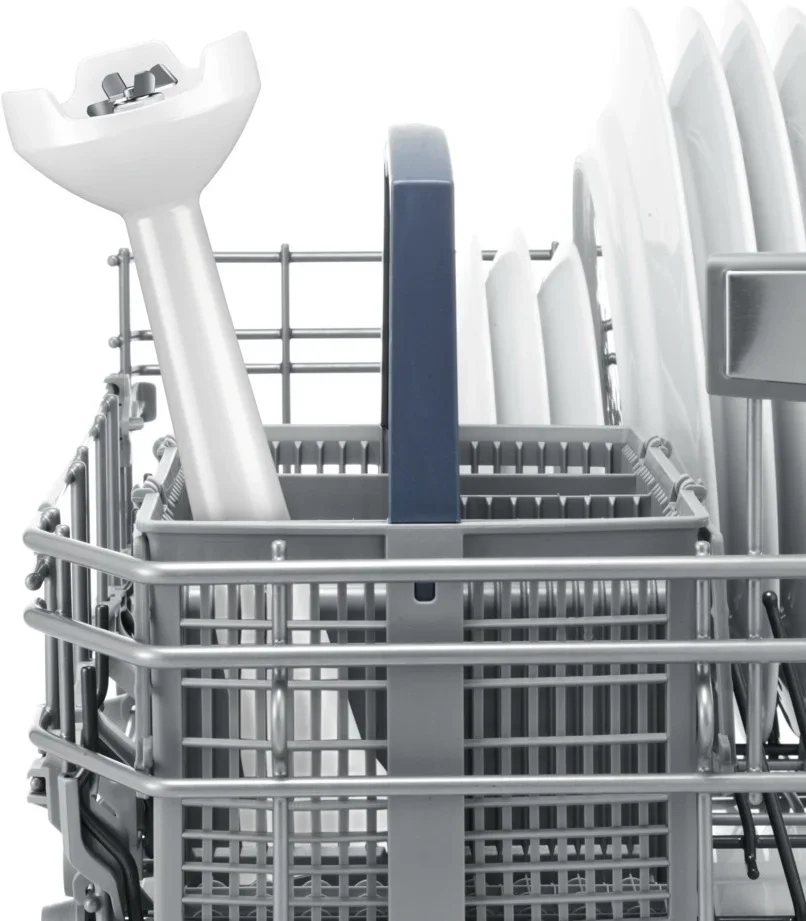 Из комплектных аксессуаров в набор входит мерный стакан пластиковый объёмом 0,7 л — удобно дозировать ингредиенты. Погружная часть выполнена из пластика и оснащена ножом с четырьмя лезвиями QuattroBlade, что повышает равномерность обработки продуктов. Эргономичная ручка помогает контролировать прибор во время работы, а съёмные элементы можно мыть в посудомоечной машине, что упрощает уход.