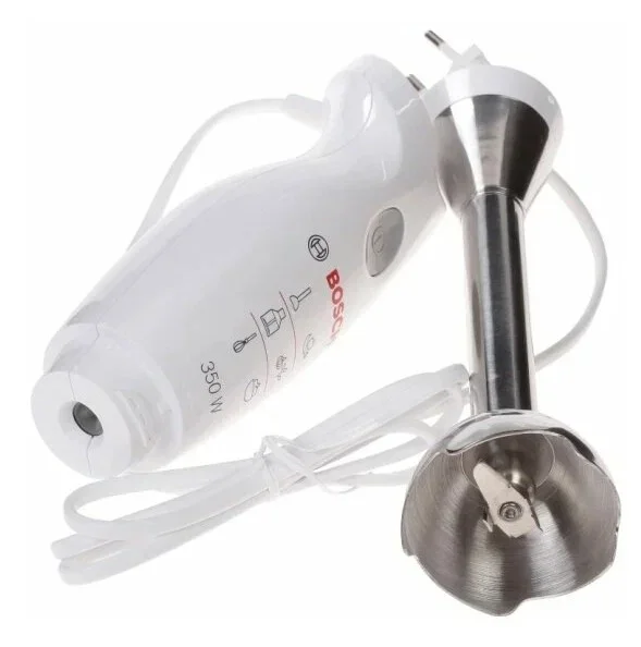 Погружной блендер Bosch MSM 6B500 имеет изящный и при этом эргономичный дизайн. Белый корпус из прочного пластика сочетается с погружной частью из нержавеющей стали и строгим лаконичным силуэтом. Компактные габариты 37.4×6.1×6.1 см делают прибор незаметным на кухне и удобным для хранения в шкафу или на полке.