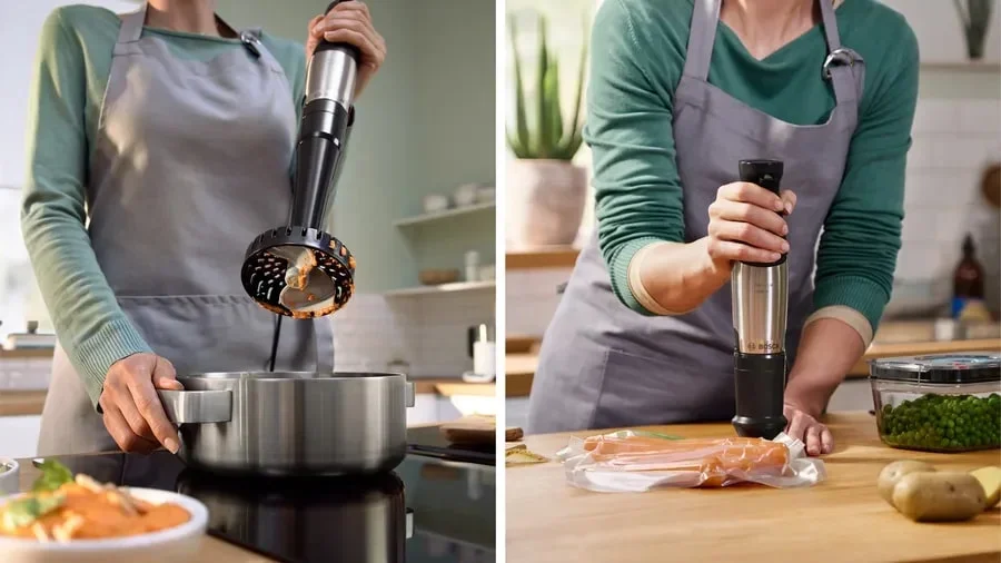 Эргономичная ручка обеспечивает надёжный хват даже при длительной работе, а её текстурированная поверхность предотвращает выскальзывание. Вес прибора сбалансирован так, чтобы минимизировать усталость кисти. Благодаря компактным размерам и отсутствию стационарной чаши, блендер не занимает место на столешнице и легко хранится в ящике.
