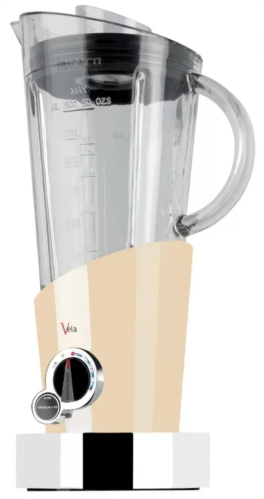 Стационарный блендер Bugatti позволяет готовить смузи, коктейли, смешивать соусы и заправки, измельчать продукты до состояния пюре и многое другое. Его конструкция подразумевает автономную работу — вам нужно только положить овощи или фрукты и выбрать режим. Корпус сделан в основном из металла, что повышает надежность прибора. Он может как влиться в общую гамму интерьера, так и стать ярким акцентом; доминирующий цвет — кремовый.