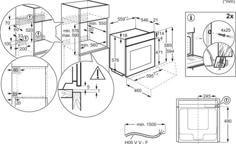 Габариты прибора составляют 59,4 см по вертикали, 59,5 см по горизонтали и 56,7 см в глубину, что делает его идеально совместимым с большинством стандартных кухонных модулей. Для монтажа требуется ниша размером 60×56×55 см, что гарантирует плотную, но безопасную посадку с учётом вентиляционных зазоров. Такие параметры упрощают замену старой техники и обеспечивают аккуратный внешний вид без щелей или перекосов.