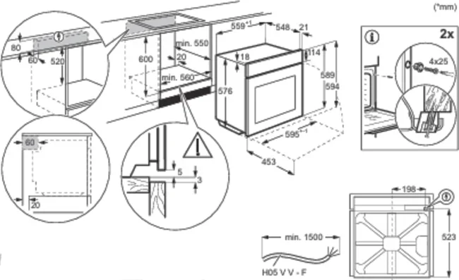 Габариты устройства составляют 59,4 см в высоту, 59,5 см в ширину и 56,9 см в глубину — параметры, полностью соответствующие общепринятым стандартам для встраиваемой техники. Такие размеры обеспечивают лёгкую интеграцию в большинство кухонных гарнитуров. Для корректного монтажа требуется ниша размером 60×56×55 см, что обеспечивает плотную фиксацию, аккуратный внешний вид и необходимую вентиляцию. Небольшой технологический зазор между корпусом и стенками проёма способствует эффективному теплоотводу и продлевает срок службы компонентов.