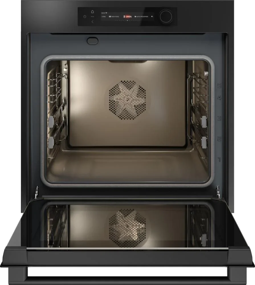 Материалы и комплект поставки: внутренняя камера с покрытием пиролитическая эмаль, обеспечивающая возможность очистки при высоких температурах; дверца состоит из четырёх стекол и имеет «холодную» поверхность. В комплекте — две съёмные противни, решётка, термощуп и двухуровневые телескопические направляющие; всего пять положений для противней, направляющие навесные и съёмные для удобства эксплуатации. Регулировка яркости и цветовой температуры освещения делает работу с камерой более комфортной.