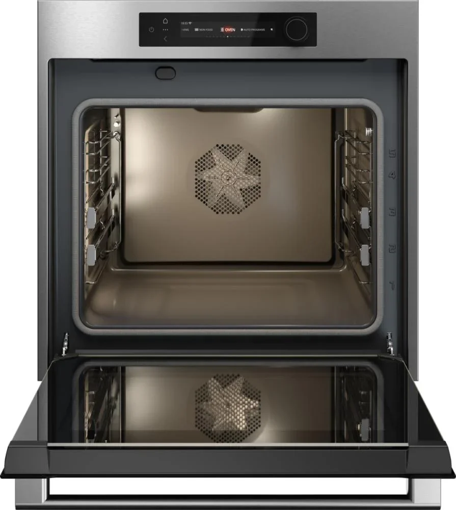 По функциям прибор независимый и подключается по электросети; при габаритах 60×59×56 см он рассчитан на нишу 59×56×55 см, объём камеры 71 л и пять уровней приготовления дают простор для крупных блюд. В наборе 12 режимов работы, 96 автоматических программ и функция памяти помогают повторять удачные рецепты. Среди режимов — верхний/нижний и только нижний нагрев, конвекция, режимы для консервирования и сушки, автоматический (шеф) режим и пошаговое приготовление. Для жарки предусмотрен электрический гриль большой площади, а дополнительные режимы включают гриль+вентилятор и «горячие камни». Устройство поддерживает быстрый разогрев, режим Шаббат, ECO-режим, нагрев снизу с вентилятором, классический нагрев с вентилятором, разогрев и стерилизацию, аэрогриль/аэрофритюр, функцию 360°AirFlow и уменьшение влажности. Температуру можно устанавливать в диапазоне 30-315 °C, максимальная отметка 315 °C. Есть таймер и электронные часы, отсрочка включения и интеграция с приложением ConnectLife, а также защита от детей.
