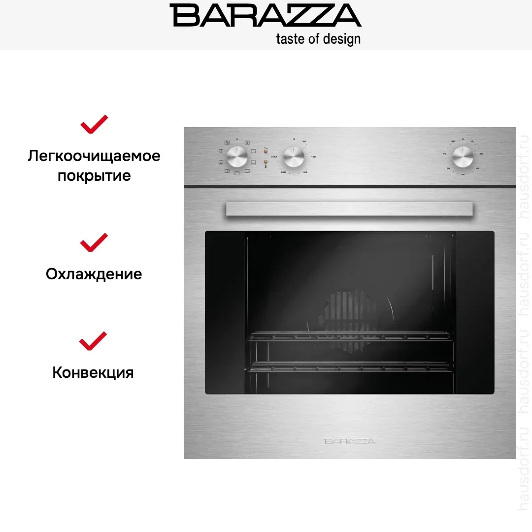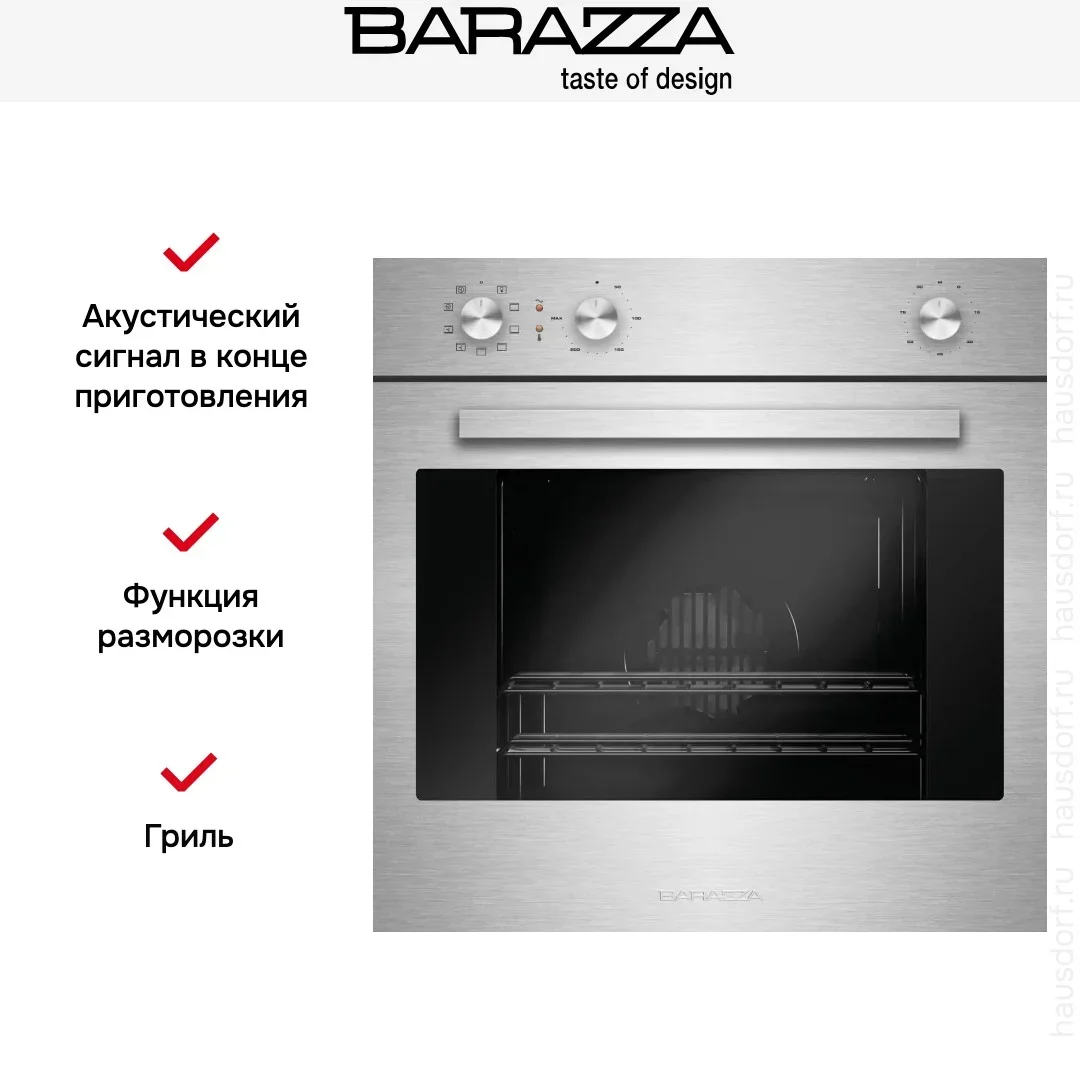 Духовой шкаф Barazza 1FOAM — это практичное и надёжное решение для кухни, сочетающее в себе классический подход к управлению и современные функциональные возможности. Модель относится к категории независимых устройств, что позволяет устанавливать её в любом удобном месте без привязки к варочной панели. Подключение осуществляется к электрической сети, что обеспечивает стабильную и безопасную эксплуатацию. Габариты корпуса составляют 59,6 см в высоту, столько же в ширину и 54,5 см в глубину, что соответствует общепринятым стандартам встраиваемой техники. Для правильного монтажа требуется ниша размером 58×56×55 см, обеспечивающая плотное прилегание и эффективную циркуляцию воздуха. Управление осуществляется механическим способом с помощью поворотных регуляторов, что обеспечивает простоту, надёжность и долговечность — идеальный выбор для тех, кто предпочитает проверенные решения без лишней электроники. Диапазон регулировки температуры составляет от 50 до 250 градусов Цельсия, что позволяет точно подобрать режим для любого блюда — от деликатной сушки трав до интенсивного запекания мяса. Встроенный таймер с функцией звукового оповещения и автоматическим отключением, а также акустический сигнал, оповещающий об окончании процесса приготовления. Это особенно удобно, если вы заняты на кухне или вам нужно точно соблюдать время термической обработки. Благодаря лаконичному дизайну и компактным размерам духовка легко вписывается в интерьеры разных стилей, не нарушая их гармонии. Надежная конструкция, качественные материалы и продуманная эргономика делают этот прибор долговечным и удобным в повседневном использовании. Он подойдёт как для повседневной готовки, так и для приёма гостей, демонстрируя высокий уровень исполнения и функциональности.