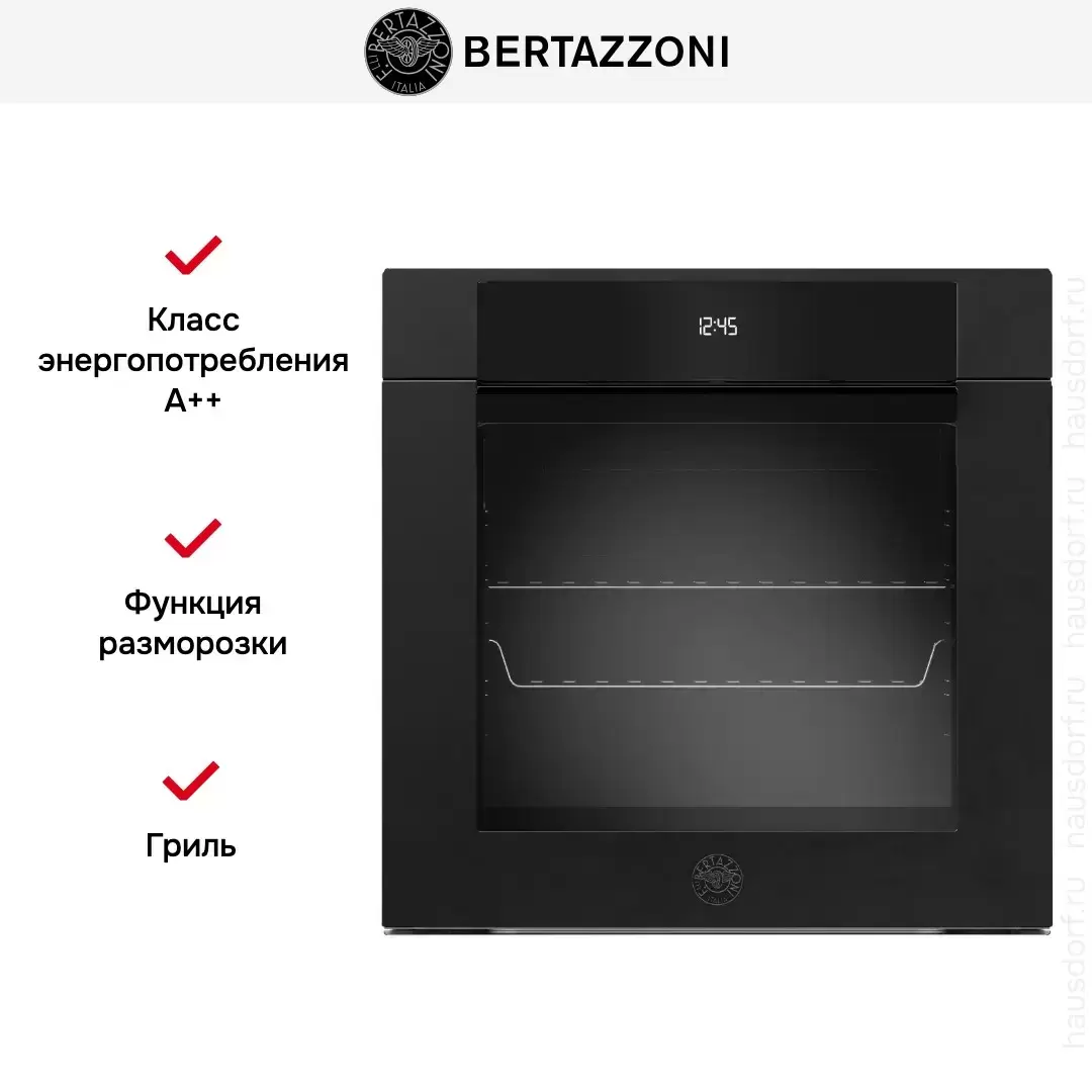 Количество режимов работы в духовом шкафу Бертаззони: 11. В число доступных программ входят: классический нагрев, нижний нагрев, конвекция, гриль для создания хрустящей корочки, сушка для овощей и фруктов, медленное приготовление при низкой температуре, и другие. Помимо основных программ воспользуйтесь специальными возможностями этого прибора: размораживанием продуктов, чтобы сократить время на подготовку; опцией автоматического поднятия теста; быстрым разогревом для ускорения работы; поддержанием температуры в камере на определенном уровне, чтобы блюда не остывали; и другими. Тип гриля в этой модели — электрический.