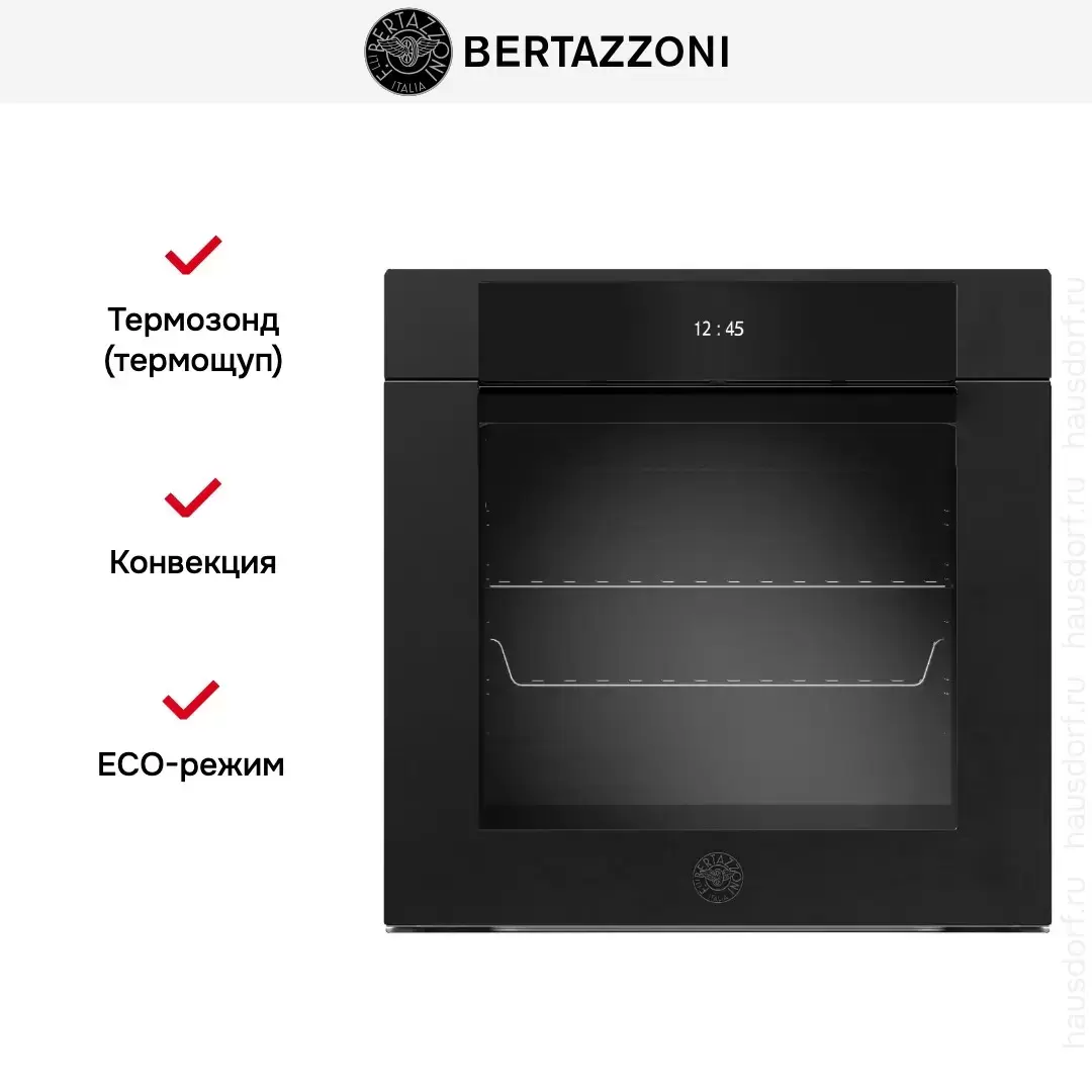 Количество режимов работы в духовом шкафу Бертаззони: 11. В число доступных программ входят: классический нагрев, нижний нагрев, конвекция, гриль для создания хрустящей корочки, сушка для овощей и фруктов, медленное приготовление при низкой температуре, и другие. Помимо основных программ воспользуйтесь специальными возможностями этого прибора: размораживанием продуктов, чтобы сократить время на подготовку; опцией автоматического поднятия теста; быстрым разогревом для ускорения работы; поддержанием температуры в камере на определенном уровне, чтобы блюда не остывали; и другими. Тип гриля в этой модели — электрический.