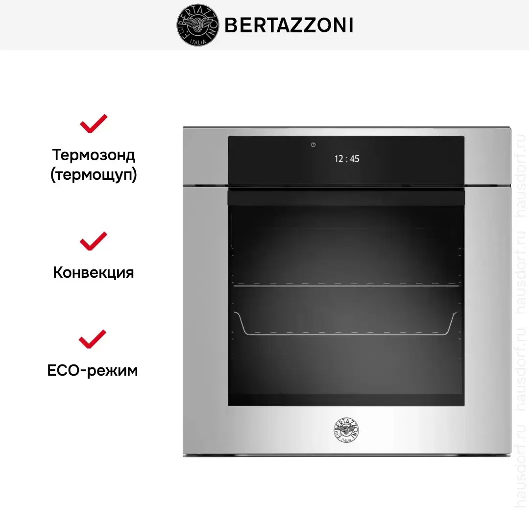 Bertazzoni F6011MODPTX — многофункциональный духовой шкаф объемом 76 л. Легко управляется с помощью полностью сенсорного TFT-дисплея. Предусмотрено 11 разнообразных функций, идеально подходящих для приготовления при средних и низких температурах. Изнутри камера покрыт серой пиролитической эмалью, освещается с двух сторон.