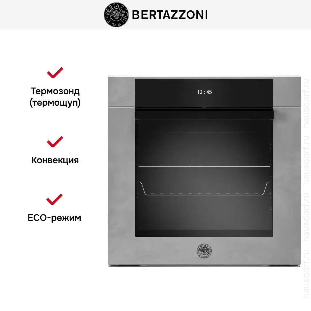 Bertazzoni F6011MODPTZ — многофункциональный духовой шкаф. Легко управляется с помощью полностью сенсорного TFT-дисплея. Предусмотрено 11 разнообразных режимов и ряд полезных функций: размораживание, эко, шаббат, сушка, расстойка теста, поддержание тепла. Изнутри камера покрыта серой пиролитической эмалью, удобно освещается с двух сторон.