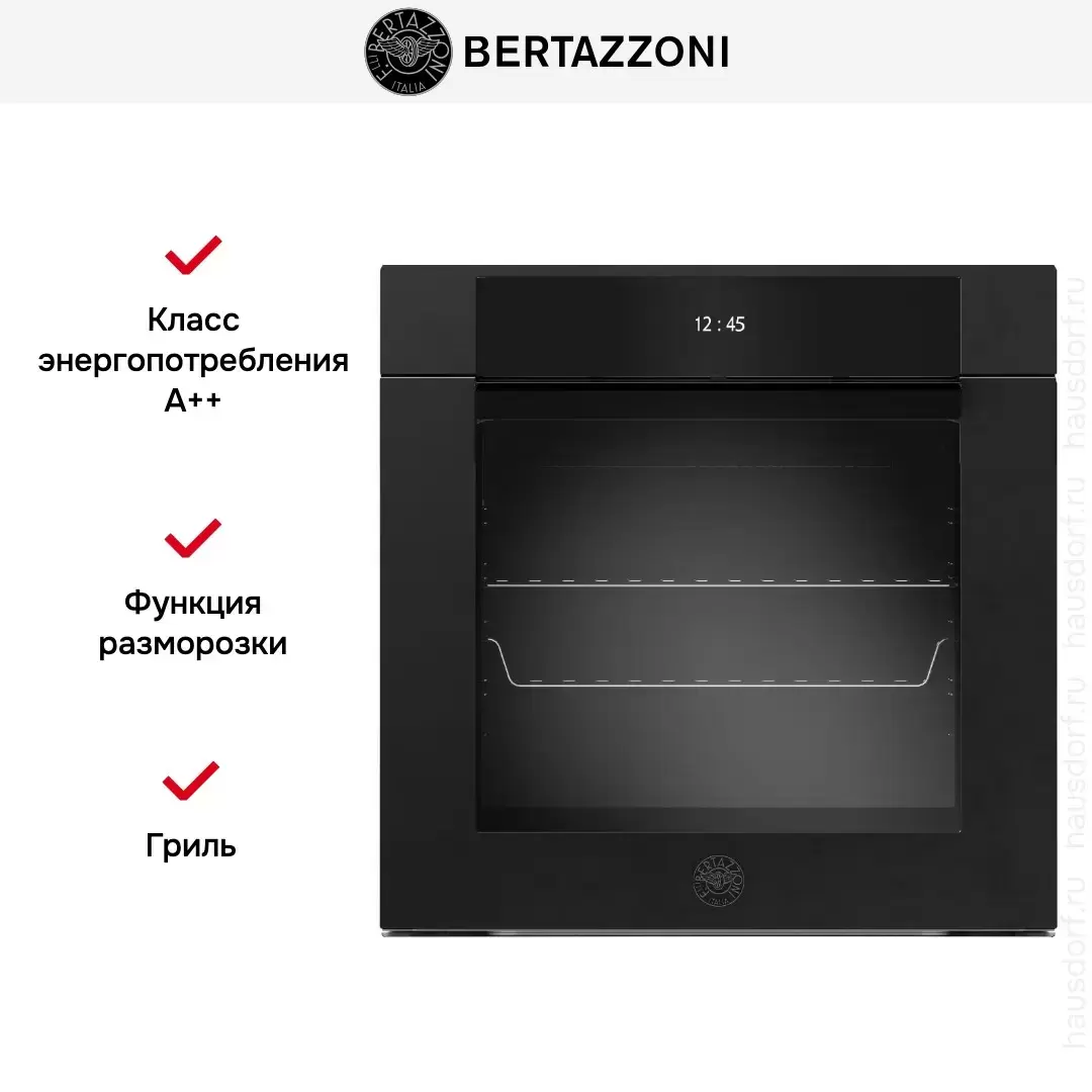 Bertazzoni F6011MODVTN — многофункциональный духовой шкаф объемом 76 л с 11 режимами. Изнутри покрыт серой пиролитической эмалью, освещается с двух сторон. Трехслойное стекло в дверце защитит от случайных ожогов. Предусмотрен ряд полезных функций: эко, расстойка теста, шаббат, высушивание, размораживание, поддержание тепла.