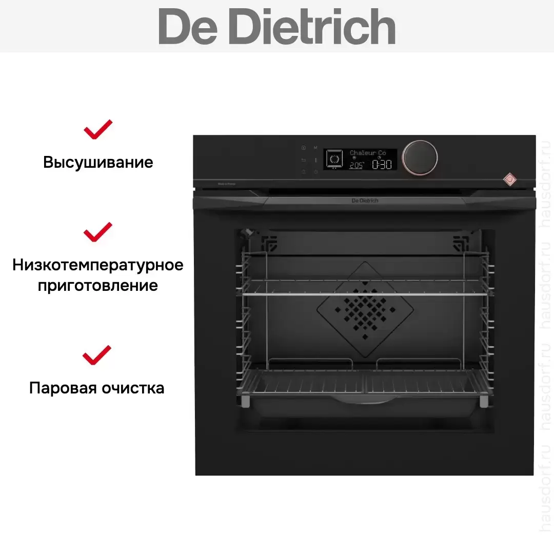 Количество режимов работы в духовом шкафу Де Дитрих: 14. В число доступных программ входят: классический нагрев, гриль для создания хрустящей корочки, сушка для овощей и фруктов, и другие. Помимо основных программ воспользуйтесь специальными возможностями этого прибора: размораживанием продуктов, чтобы сократить время на подготовку; опцией автоматического поднятия теста; и другими. Тип гриля в этой модели — электрический.