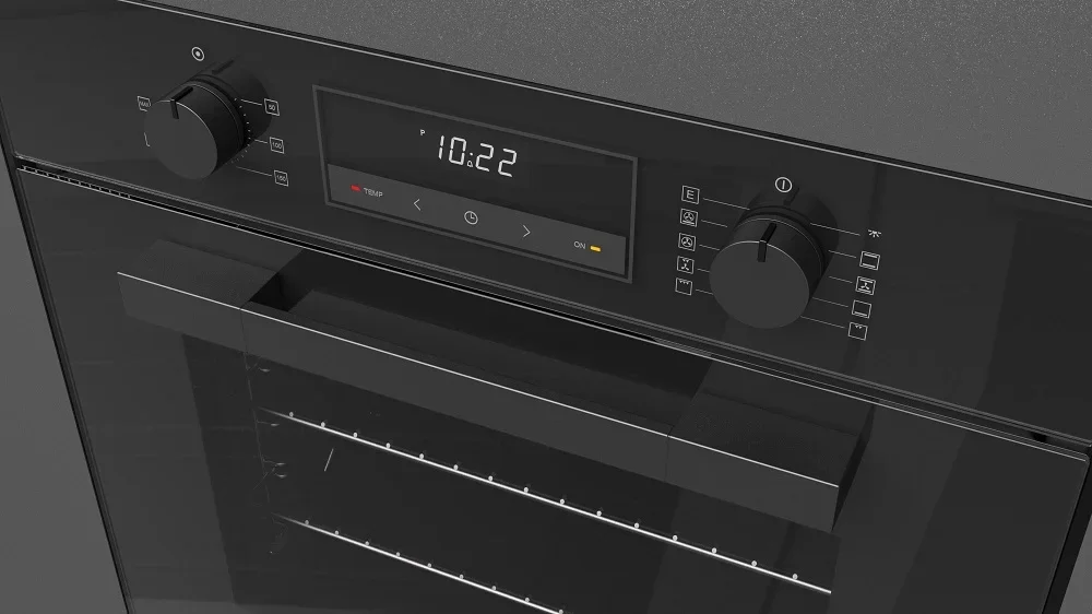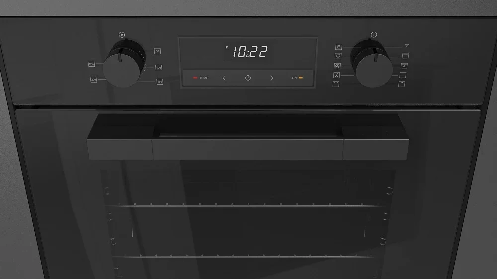 Особенности дизайна и внешней панели управления — также важный пункт при выборе духовки на кухню. В данной модели нужно обратить внимание на цвет — черное стекло, охлаждение двери, чтобы поверхность и мебель вокруг не нагревались.