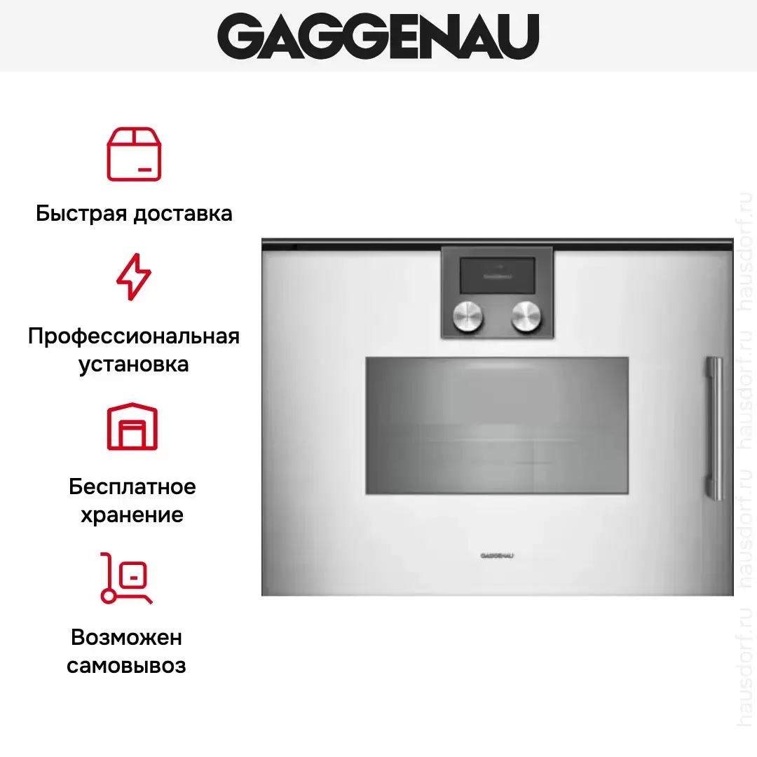 Духовой шкаф — пароварка Gaggenau BSP 261-131 обладает индикатором фактической температуры. Таймер обладает функциями приготовления, выключения, а также способен работать по краткосрочной и долгосрочной программе. Точка кипения определяется автоматически. Модель оснащена сенсорным TFT — дисплеем и поворотными переключателями. Панель управления интегрирована в дверцу и находиться сверху. Трехточеченый температурный щуп отключается автоматически и отображает время. Система безопасности «защита от детей» уберегает от нежелательного сбоя настроек. 40 автоматический программ расширяют возможности использования устройства.