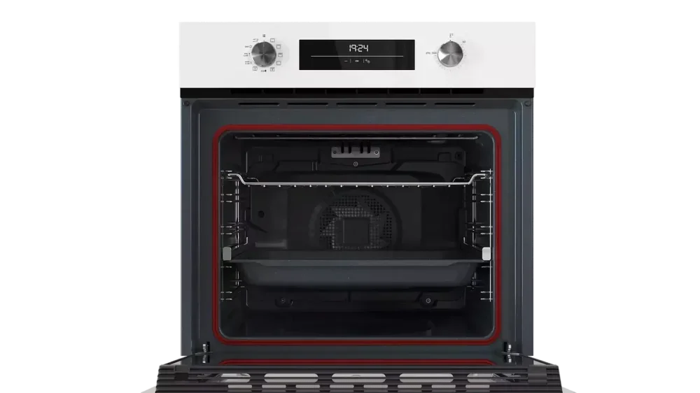 Особенности дизайна и внешней панели управления — также важный пункт при выборе духовки на кухню. В данной модели нужно обратить внимание на цвет — белый,