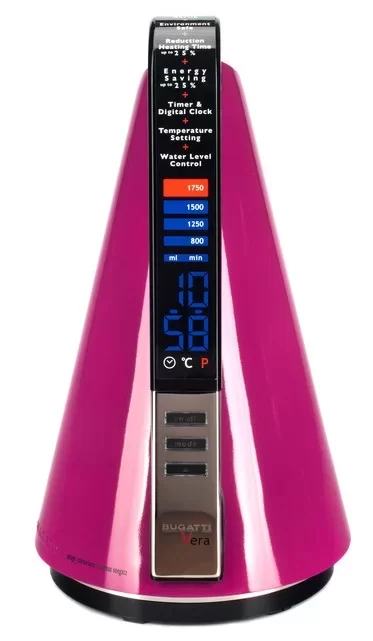 Яркая модель электрического чайника от Bugatti, с полностью сенсорным управлением и информативным дисплеем. Прибор оборудован системой тепловой защиты, которая предотвращает перегрев.