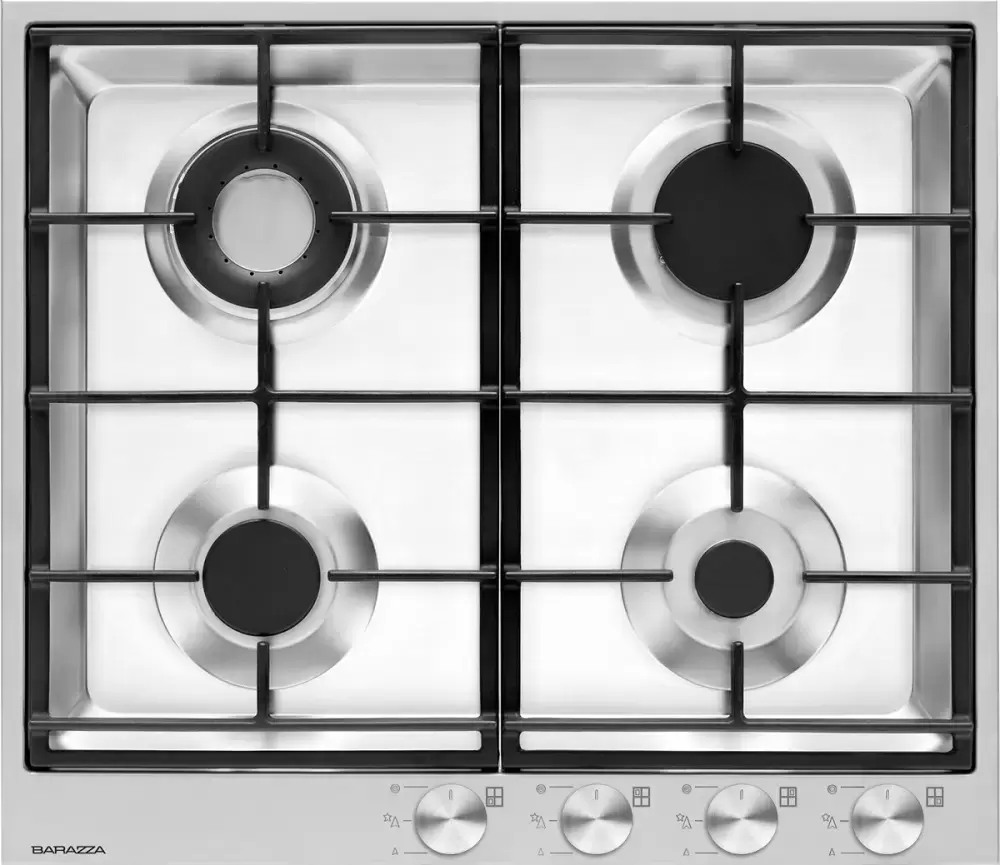 Независимая газовая варочная панель Barazza 1PBF64 шириной 60 см из дизайн-коллекции B_FREE устанавливается сверху на стандартную кухонную тумбу. Модель изготовлена из очень толстой нержавеющей стали AISI 304 с атласной поверхностью и отличается легкостью в очистке. Раздельная чугунная решетка позволяет устойчиво разместить посуду. Для бесступенчатой регулировки мощности предназначены механические поворотные переключатели со стальными ручками.
