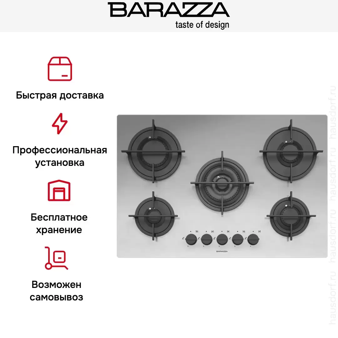 Газовая варочная панель Barazza 1PMD75 шириной 75 см из дизайн-коллекции MOOD оснащена пятью конфорками, в том числе конфоркой «Двойная корона» с двумя рядами пламени и скоростной конфоркой высокой мощности. Поверхность с прямым краем изготовлена из особо прочной нержавеющей стали AISI толщиной 304 мм с матовой поверхностью. Для размещения посуды служит съемная раздельная чугунная решетка.