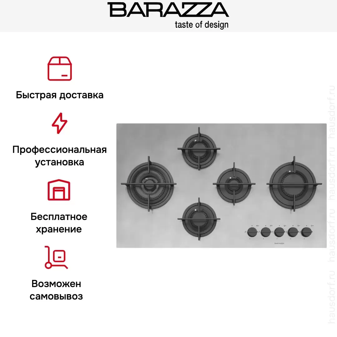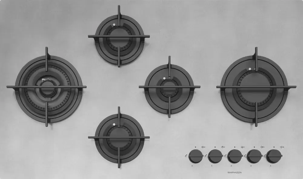 Газовая варочная панель Barazza 1PMDM95 шириной 86 см с 5 конфорками входит в дизайн-коллекцию MOOD, она изготовлена из особо толстой нержавеющей стали AISI 304 с матовой поверхностью и имеет прямой край без рамки. Варочная панель встраивается над столешницей; для размещения посуды служит раздельная чугунная решетка лаконичной формы.