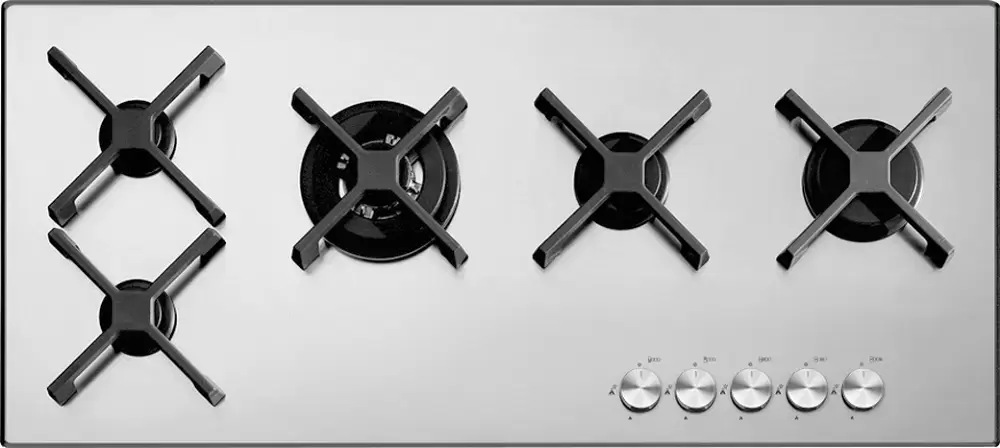 Посуда устойчиво размещается на раздельных чугунных решетках. Материал изготовления варочной поверхности — очень толстая нержавеющая сталь AISI 304. Для включения горелок без зажигалок или спичек предусмотрен электроподжиг. На каждой горелке установлена термопара для блокировки подачи газа при угасании пламени.