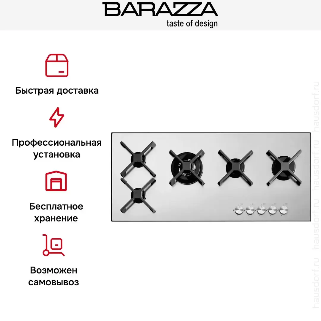Независимая газовая варочная панель Barazza 1PSP105 шириной 100 см относится к дизайн-серии SELECT PLUS. Ее глубина составляет 45 см: благодаря расположению конфорок в одну линию такая модель может устанавливаться на кухонном острове. В центре находится особо мощная конфорка «Тройная корона», справа от нее — быстрая конфорка и менее мощная стандартная, а справа — две вспомогательные конфорки. Справа расположена и механическая панель управления с поворотными переключателями для плавной регулировки пламени.