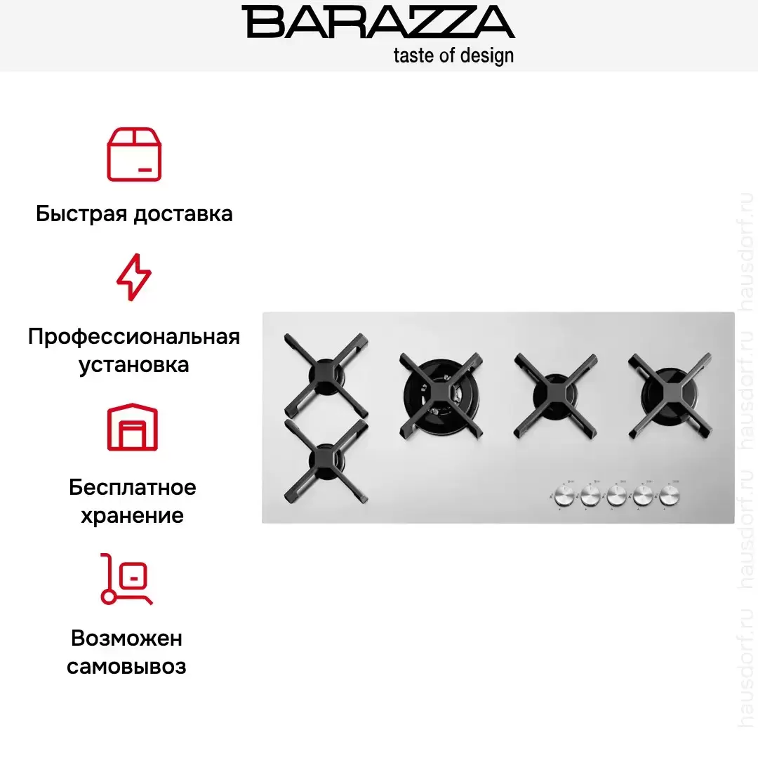 Газовая варочная панель Barazza 1PSPF105 — независимая модель шириной 100 см из дизайн-коллекции SELECT PLUS. Она отличается оригинальным расположением конфорок: три из них, включая особо мощную «Тройная корона», быструю и стандартную конфорки, располагаются в одну линию, а две маломощные конфорки расположены слева в два ряда. Справа в передней части находится механическая панель управления с поворотными переключателями для плавной регулировки пламени, оснащенными металлическими не нагревающимися рукоятками.