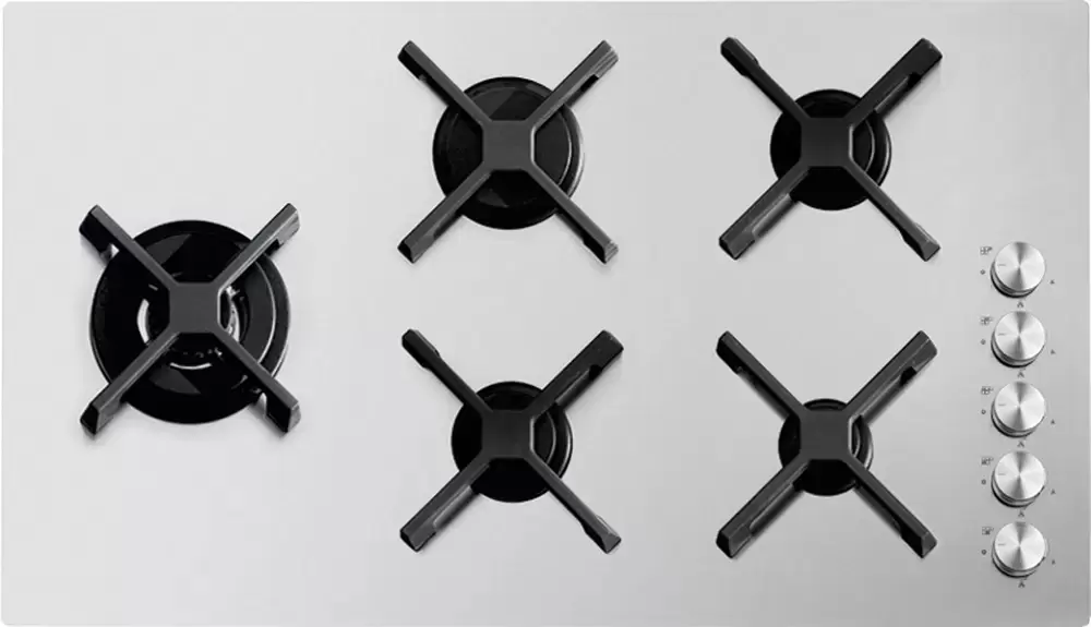 Газовая варочная панель Barazza 1PSPF95 — независимая модель шириной 86 см с пятью конфорками из коллекции SELECT PLUS. Поверхность, изготовленная из особо толстой нержавеющей стали AISI 304, может быть установлена над столешницей или вровень с ней. В левой части находится конфорка «Тройная корона» с тремя рядами пламени: ее можно использовать для приготовления блюд азиатской кухни в сковороде с округлым дном. Справа находятся быстрая конфорка, две стандартные и вспомогательная маломощная конфорка.