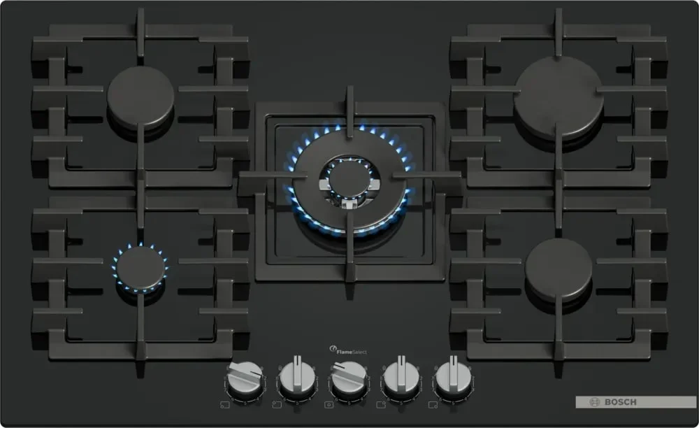 Выбор газовой варочной панели чаще всего обусловлен тем, что в частный дом или квартиру проведен именно газ в качестве обогрева. Работать с этой моделью довольно просто, так как мощность нагрева видна невооруженным взглядом — по силе огня в горелке. Количество конфорок в этой модели: 5.